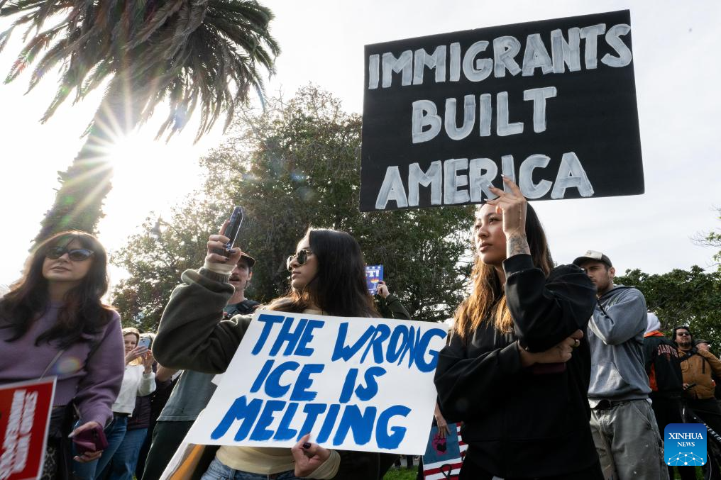 People attend a rally in San Francisco, the United States, Jan. 30, 2026. Protesters gathered across the United States on Friday for a nationwide general strike against federal immigration enforcement operations and the recent fatal shootings by immigration agents. (Photo by Ziyu Julian Zhu/Xinhua)