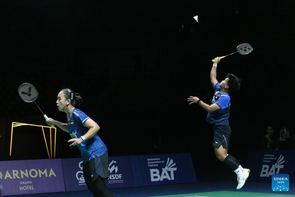 Meilysa Trias Puspitasari (R)/Febriana Dwipuji Kusuma compete during the women's doubles semifinal match between Bao Lijing/Li Yijing of China and Meilysa Trias Puspitasari/Febriana Dwipuji Kusuma of Indonesia at the Thailand Masters 2026 badminton tournament in Bangkok, Thailand, Jan. 31, 2026. (Xinhua/Rachen Sageamsak)