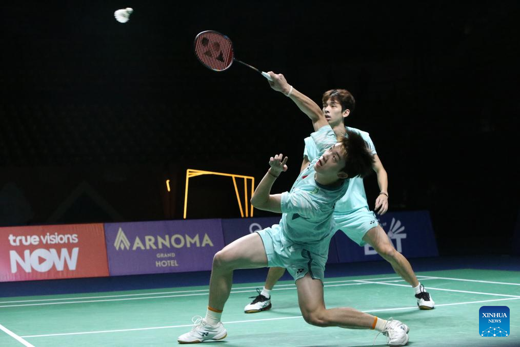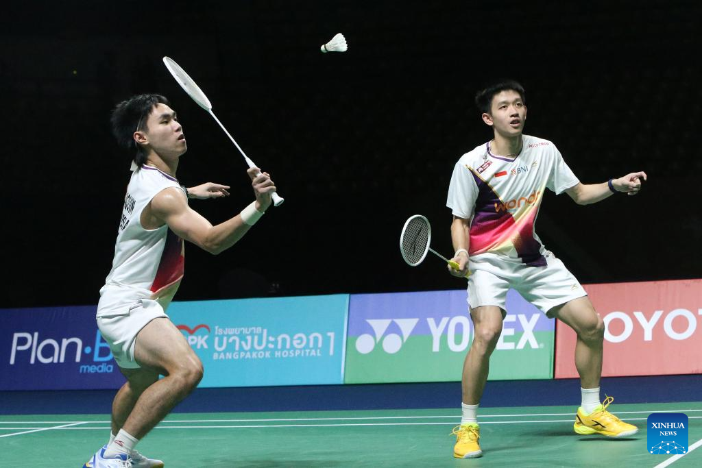 Hu Keyuan/Lin Xiangyi (R) compete during the men's doubles semifinal match between Hu Keyuan/Lin Xiangyi of China and Raymond Indra/Nikolaus Joaquin of Indonesia at the Thailand Masters 2026 badminton tournament in Bangkok, Thailand, Jan. 31, 2026. (Xinhua/Rachen Sageamsak)