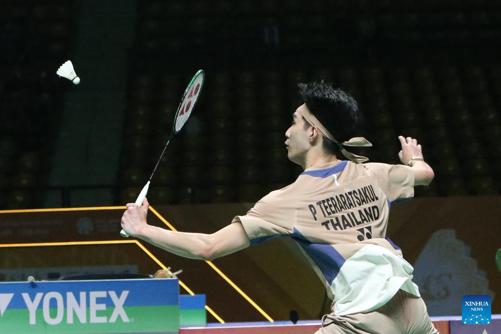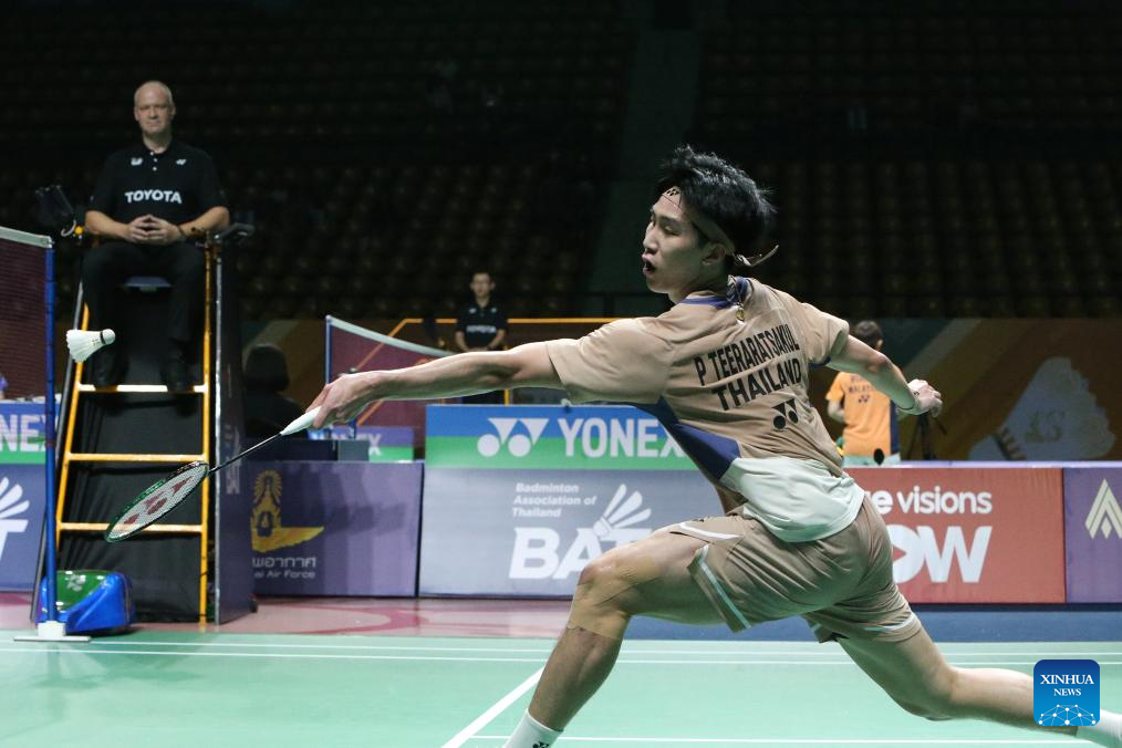 Panitchaphon Teeraratsakul hits a return during the men's singles semifinal match between Zhu Xuanchen of China and Panitchaphon Teeraratsakul of Thailand at the Thailand Masters 2026 badminton tournament in Bangkok, Thailand, Jan. 31, 2026. (Xinhua/Rachen Sageamsak)