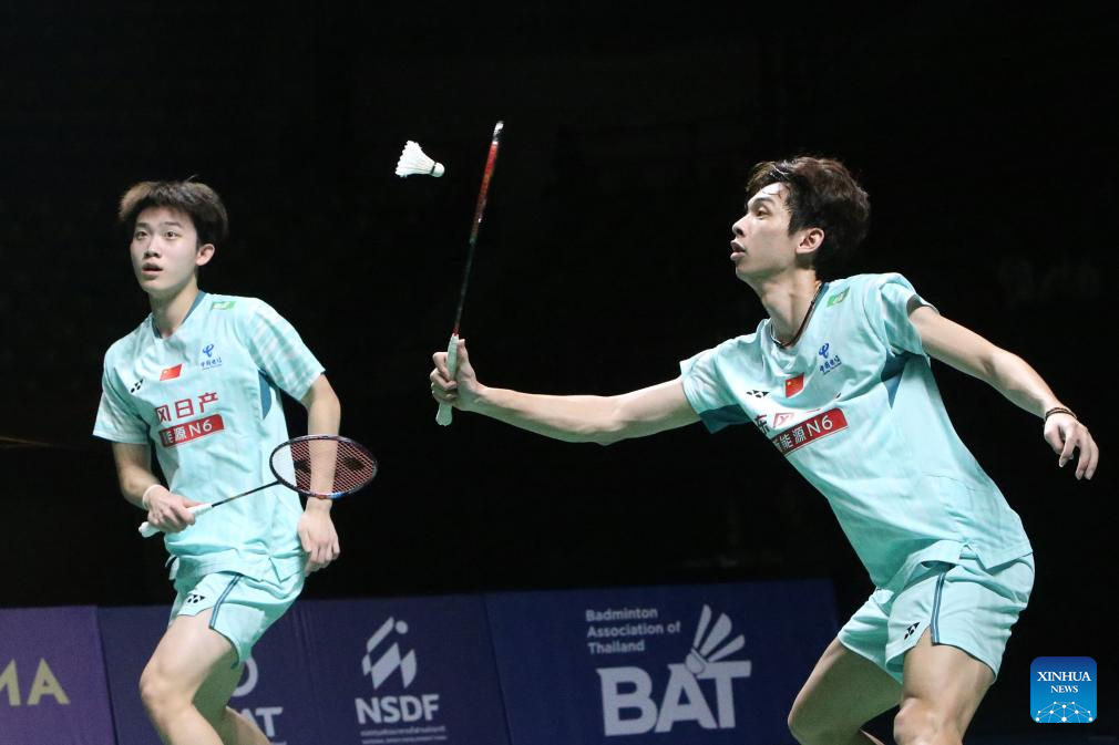 Hu Keyuan (front)/Lin Xiangyi compete during the men's doubles semifinal match between Hu Keyuan/Lin Xiangyi of China and Raymond Indra/Nikolaus Joaquin of Indonesia at the Thailand Masters 2026 badminton tournament in Bangkok, Thailand, Jan. 31, 2026. (Xinhua/Rachen Sageamsak)