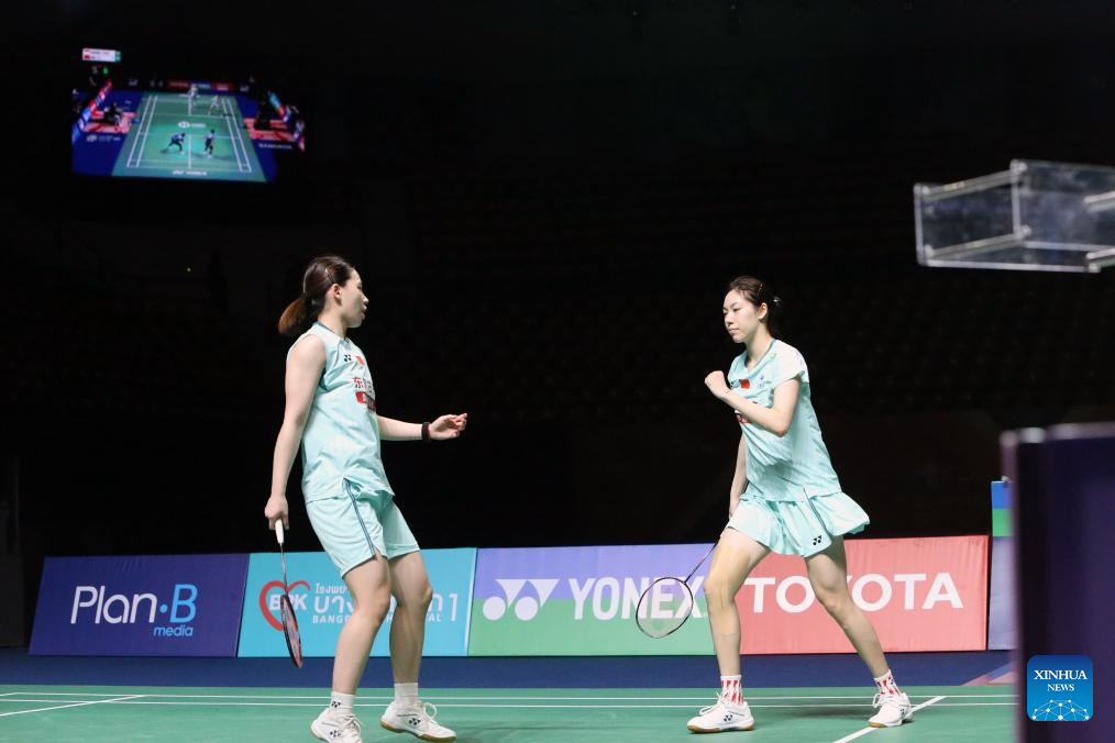 Bao Lijing (R)/Li Yijing celebrate scoring during the women's doubles semifinal match between Bao Lijing/Li Yijing of China and Meilysa Trias Puspitasari/Febriana Dwipuji Kusuma of Indonesia at the Thailand Masters 2026 badminton tournament in Bangkok, Thailand, Jan. 31, 2026. (Xinhua/Rachen Sageamsak)