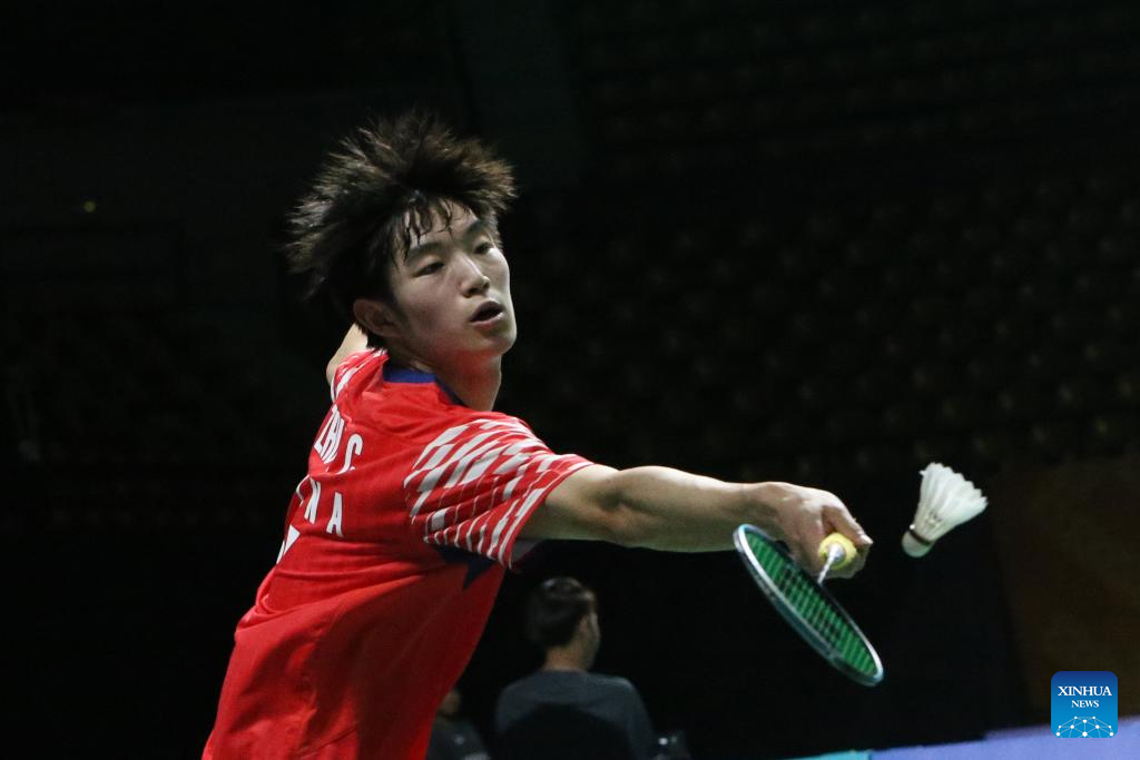 Zhu Xuanchen hits a return during the men's singles semifinal match between Zhu Xuanchen of China and Panitchaphon Teeraratsakul of Thailand at the Thailand Masters 2026 badminton tournament in Bangkok, Thailand, Jan. 31, 2026. (Xinhua/Rachen Sageamsak)