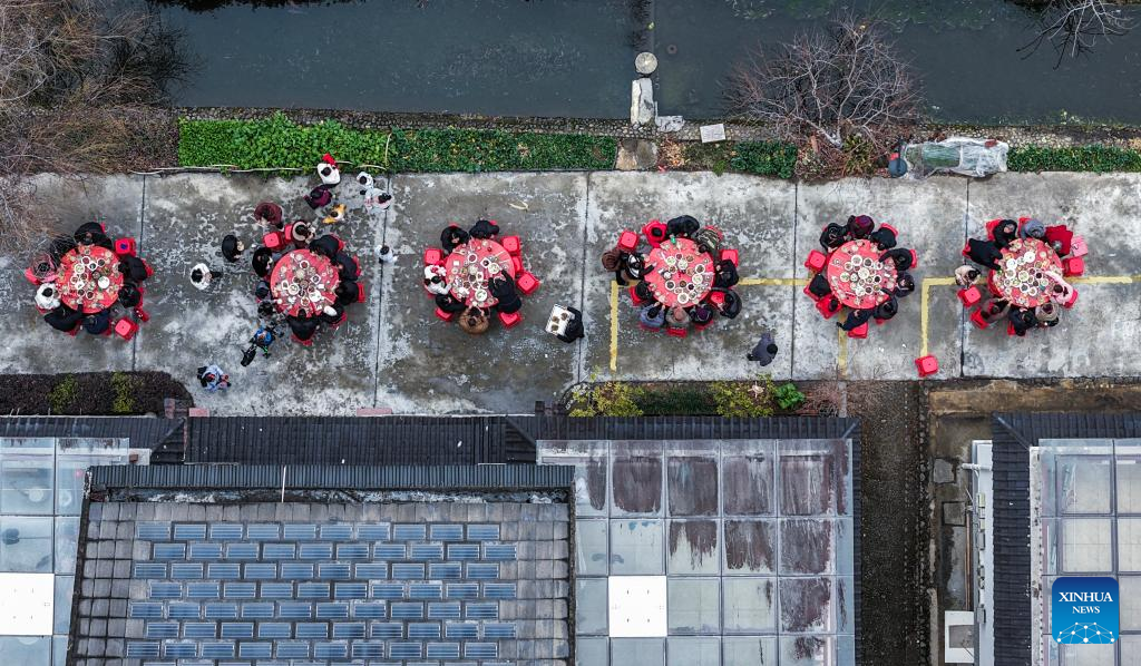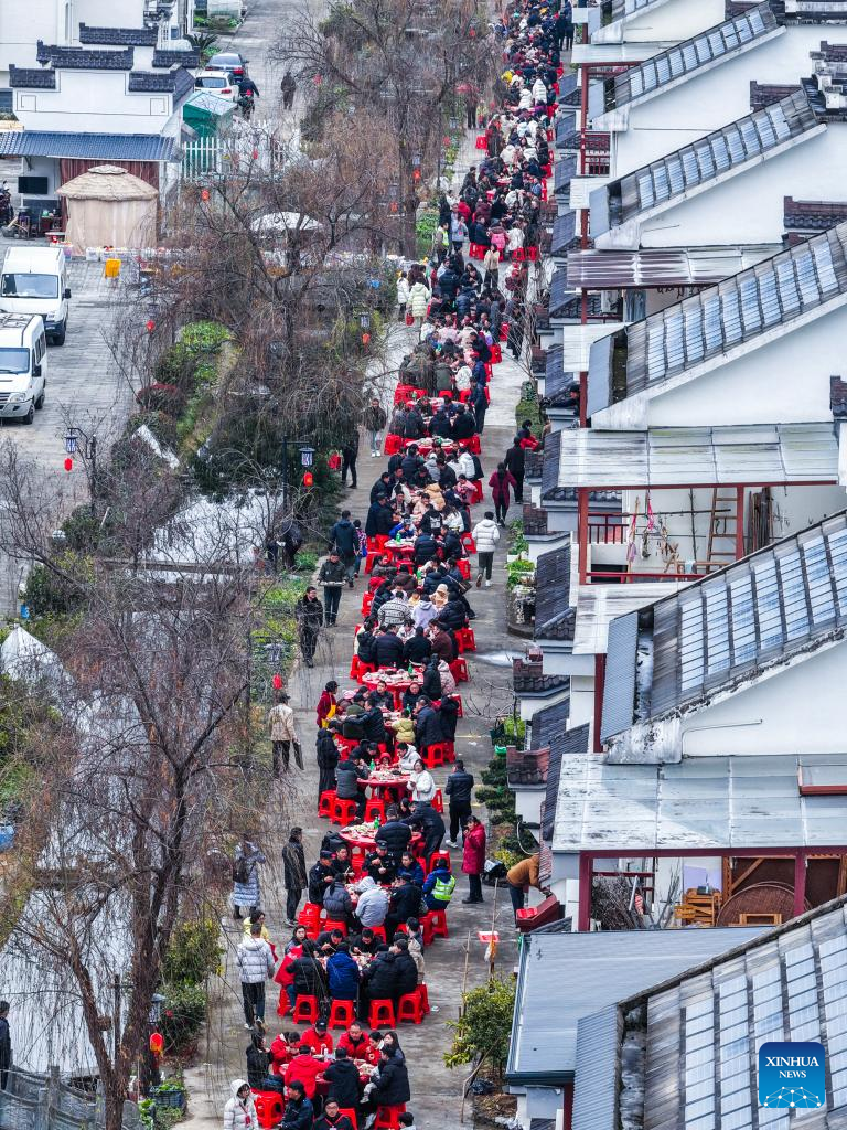 Tourists and local residents dine together in Lianhua Township, east China's Zhejiang Province, Feb. 1, 2026. A Spring Festival cultural event was held here with great enthusiasm on Sunday. Local residents and tourists enjoyed the festive market, viewed the local art exhibition, participated in traditional games, and savored local foods. (Xinhua/Xu Yu)