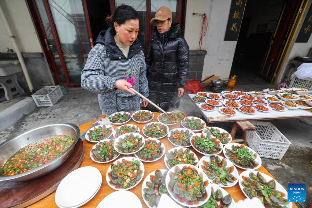 Local residents make local foods in Lianhua Township, east China's Zhejiang Province, Feb. 1, 2026. A Spring Festival cultural event was held here with great enthusiasm on Sunday. Local residents and tourists enjoyed the festive market, viewed the local art exhibition, participated in traditional games, and savored local foods. (Xinhua/Xu Yu)