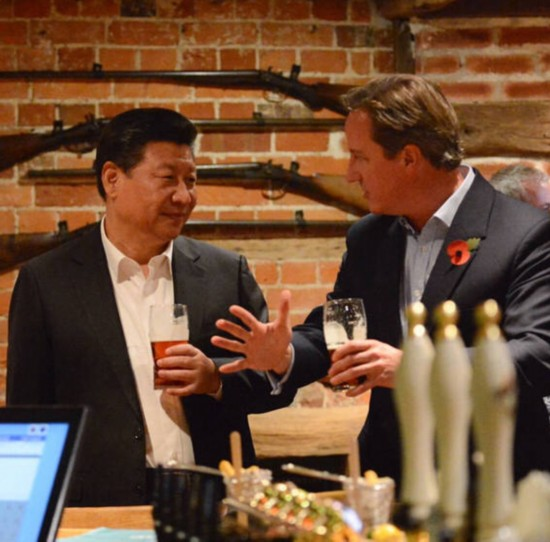 President Xi Jinping and then British Prime Minister David Cameron enjoy a Greene King IPA at The Plough at Cadsden pub, a 16th-century country inn in the Chiltern Hills of Buckinghamshire, on October 22, 2015. (File photo: Xinhua)