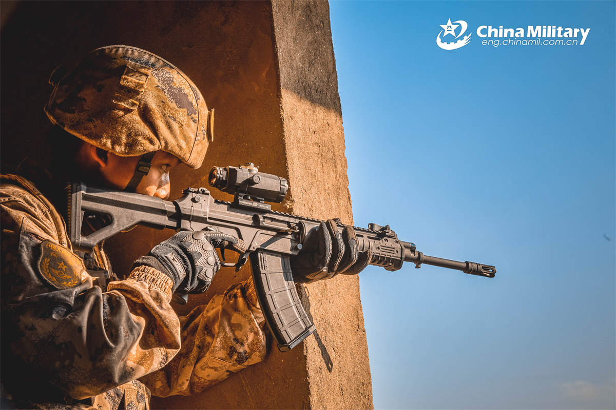 A cadet assigned to the Chinese PLA Army Infantry Academy aims his rifle from behind a wall during a squad tactics training exercise. (eng.chinamil.com.cn/Photo by Liu Haorui)