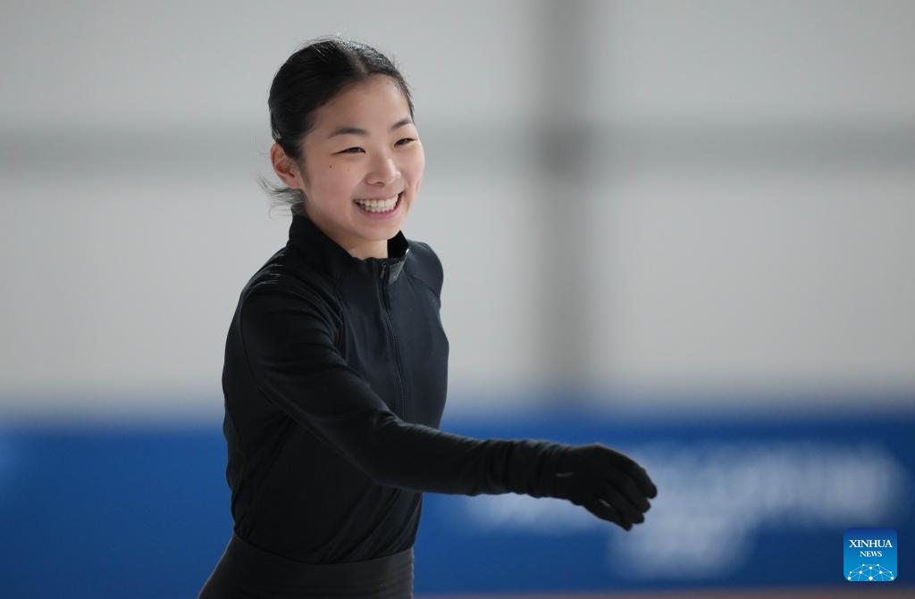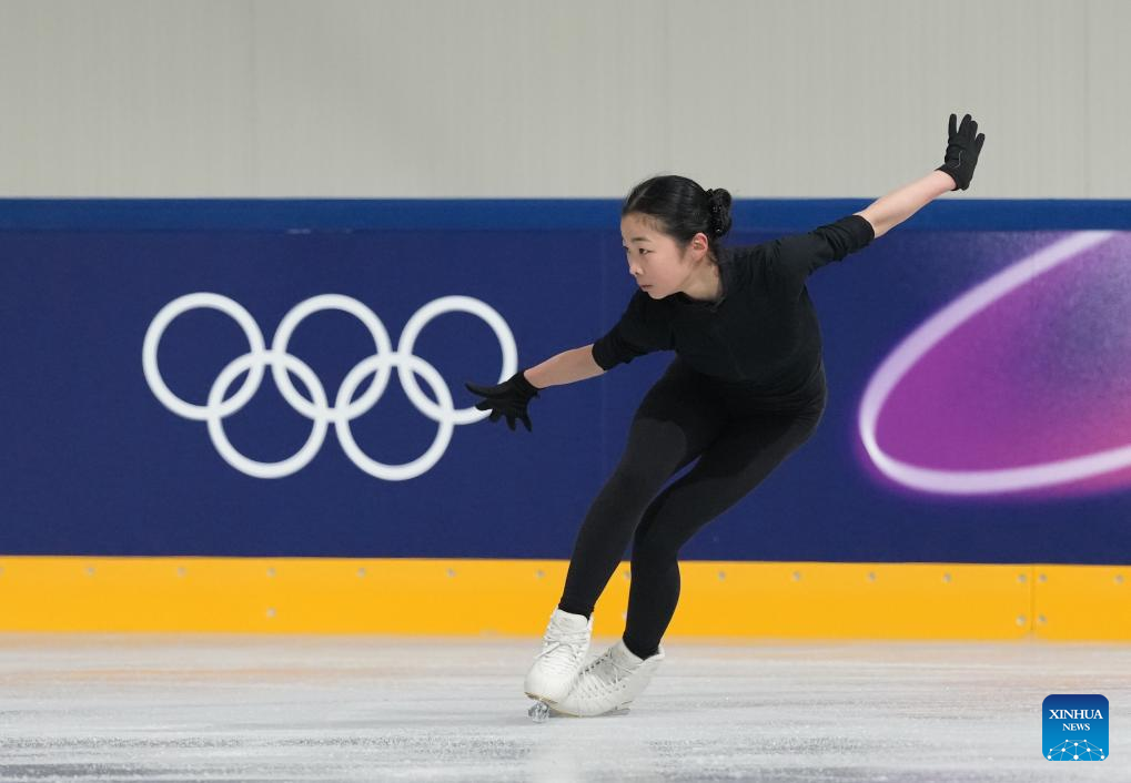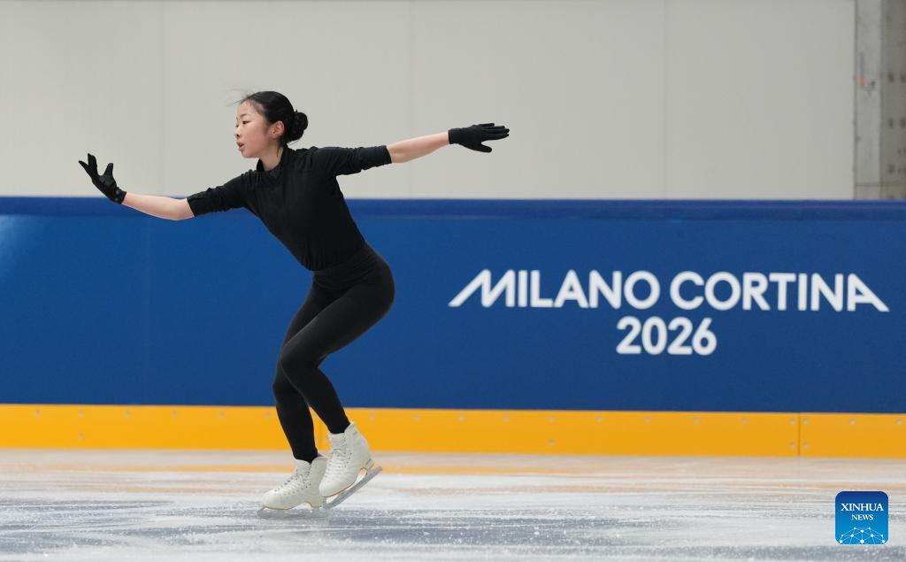 Zhang Ruiyang of China attends a figure skating training session ahead of the 2026 Milan-Cortina Winter Olympics at Milano Ice Skating Arena in Milan, Italy, Feb. 3, 2026. (Xinhua/Cheng Min)