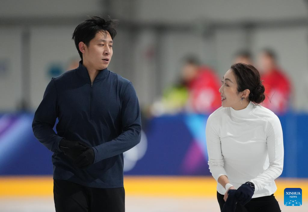 Sui Wenjing (R)/Han Cong of China attend a figure skating training session ahead of the 2026 Milan-Cortina Winter Olympics at Milano Ice Skating Arena in Milan, Italy, Feb. 3, 2026. (Xinhua/Xue Yuge)