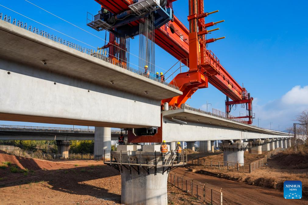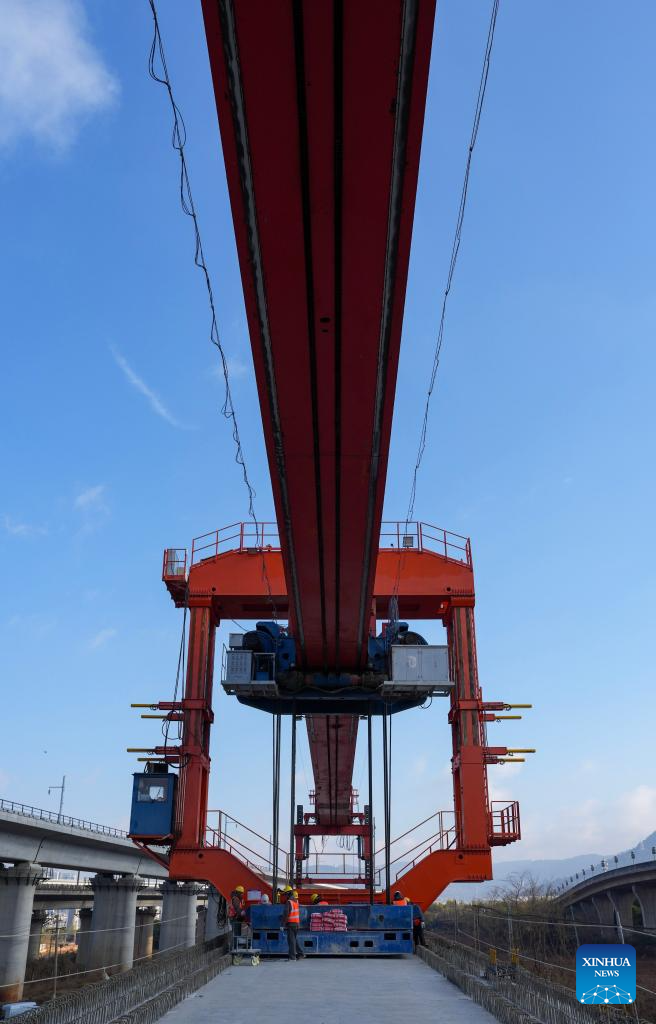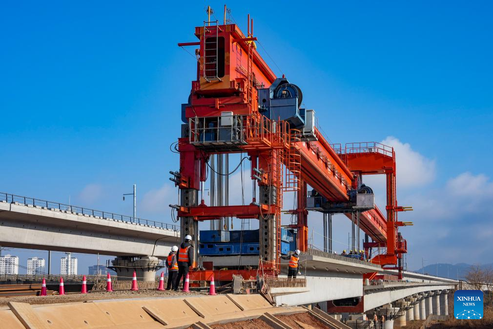 Staff members work to position the last box girder of a bridge along the Chongqing-Kunming high-speed railway in Chenggong District of Kunming, southwest China's Yunnan Province, Feb. 3, 2026. As the last box girder of a bridge was precisely positioned on Tuesday, the construction of bridges along the Chongqing-Kunming High-Speed Railway was fully completed, paving way for subsequent construction work.