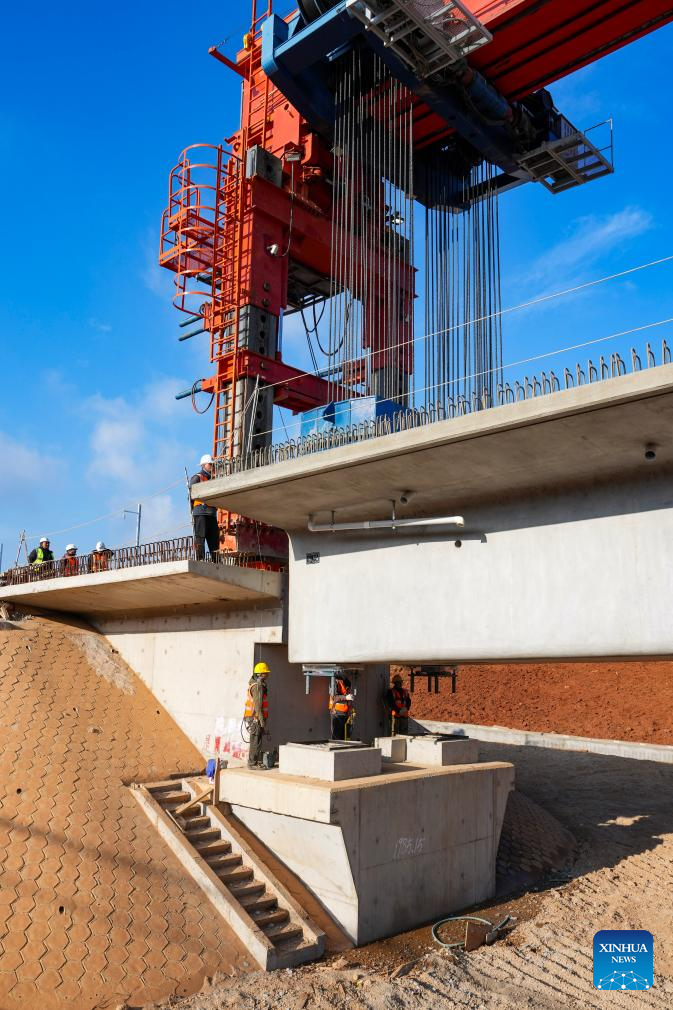A staff member works to position the last box girder of a bridge along the Chongqing-Kunming high-speed railway in Chenggong District of Kunming, southwest China's Yunnan Province, Feb. 3, 2026. As the last box girder of a bridge was precisely positioned on Tuesday, the construction of bridges along the Chongqing-Kunming High-Speed Railway was fully completed, paving way for subsequent construction work.