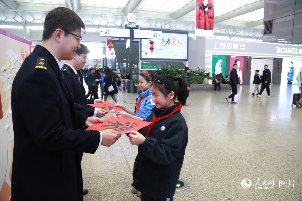 Two primary school students present the Chinese character "Fu", which means good fortune, on two pieces of paper, to staff members at Shanghai Hongqiao Railway Station in Shanghai, on Feb. 2, 2026. (People's Daily Online/Gong Sha)