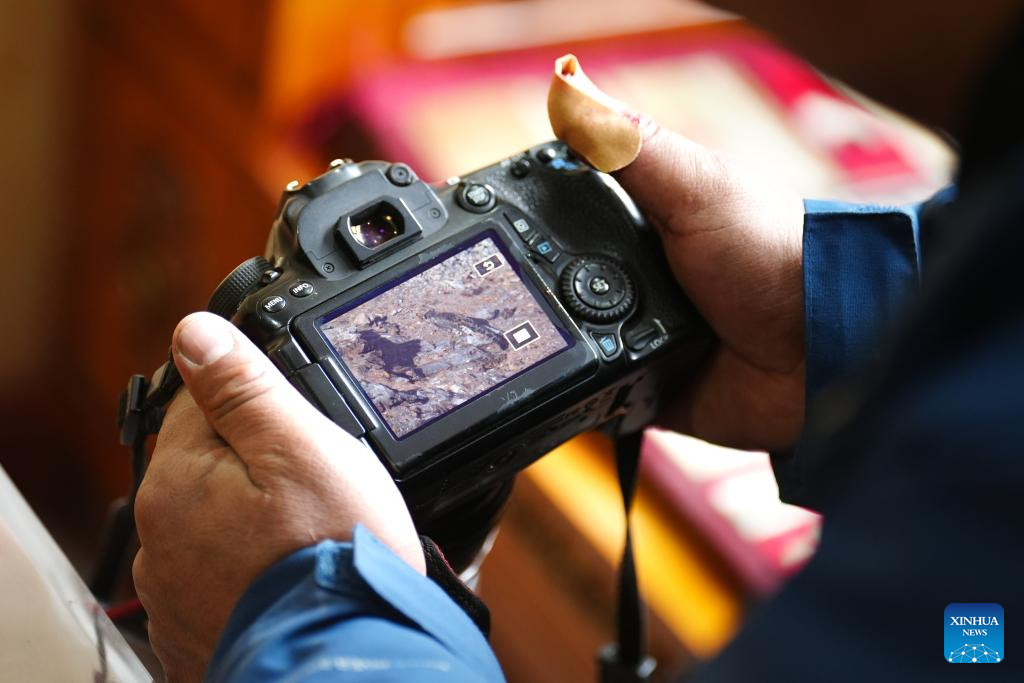 Tseten reviews a photo of a snow leopard on his camera in Angsai Township of Zaduo County, Yushu Tibetan Autonomous Prefecture, northwest China's Qinghai Province, Jan. 29, 2026. (Xinhua/Qi Zhiyue)