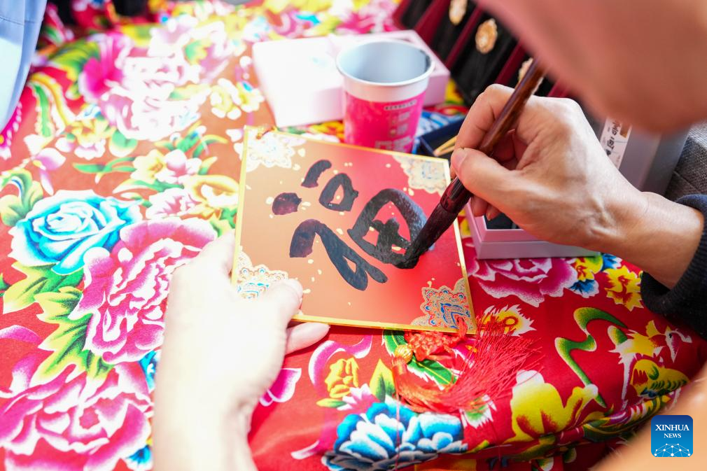 An attendant writes Chinese character "Fu" (meaning "fortune") at an "in-train fair" in northeast China's Heilongjiang Province, Feb. 4, 2026. Train K7103, the host of Heilongjiang's first "in-train fair" of 2026, departed from Harbin and headed for Jiagedaqi on Wednesday. The fair features agricultural specialties of the province, railway-themed creative cultural products, and handicrafts listed as intangible cultural heritage. Items purchased at the "fair" would be delivered to buyer-designated addresses via courier service.