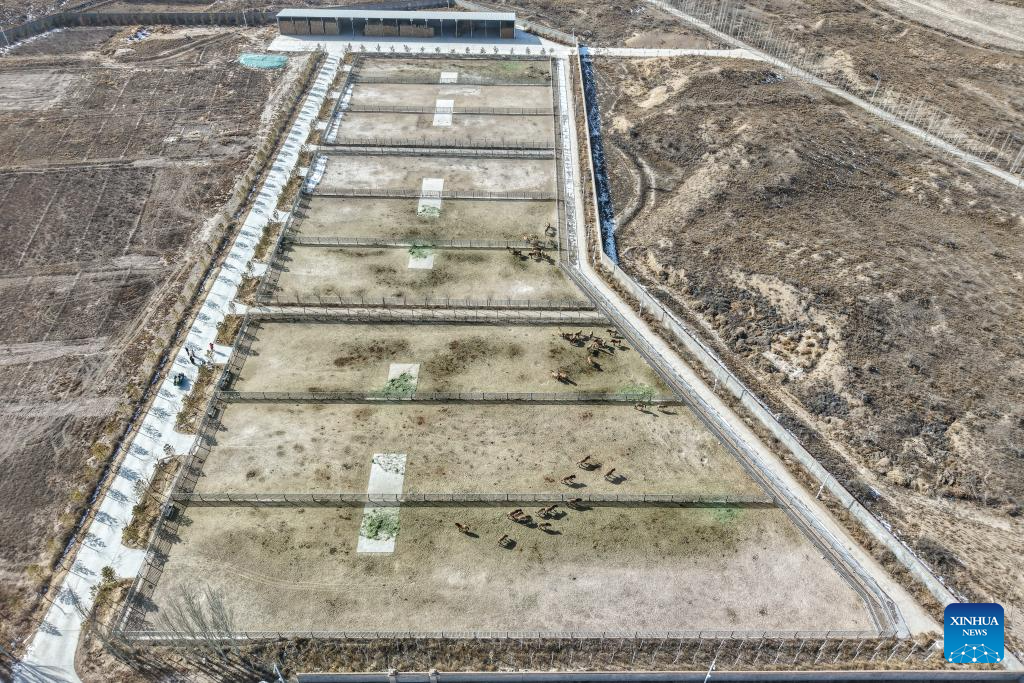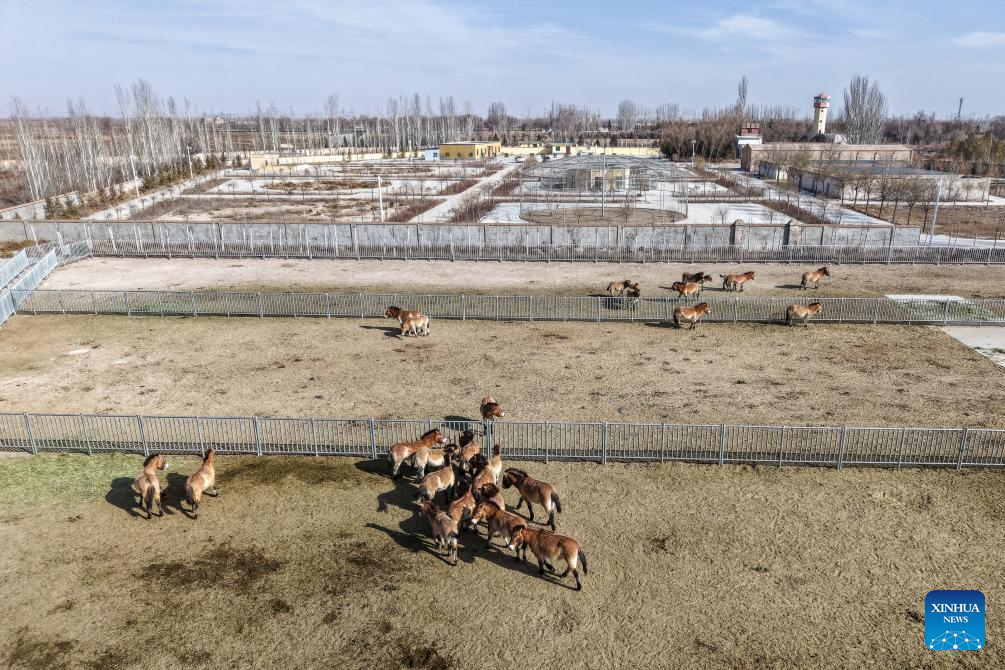 An aerial drone photo shows the Przewalski's horses breeding base at the Gansu Endangered Animal Protection Center in Wuwei City of northwest China's Gansu Province, Feb. 3, 2026. The Przewalski's horse is listed as a national first-class protected animal in China and remains endangered globally.