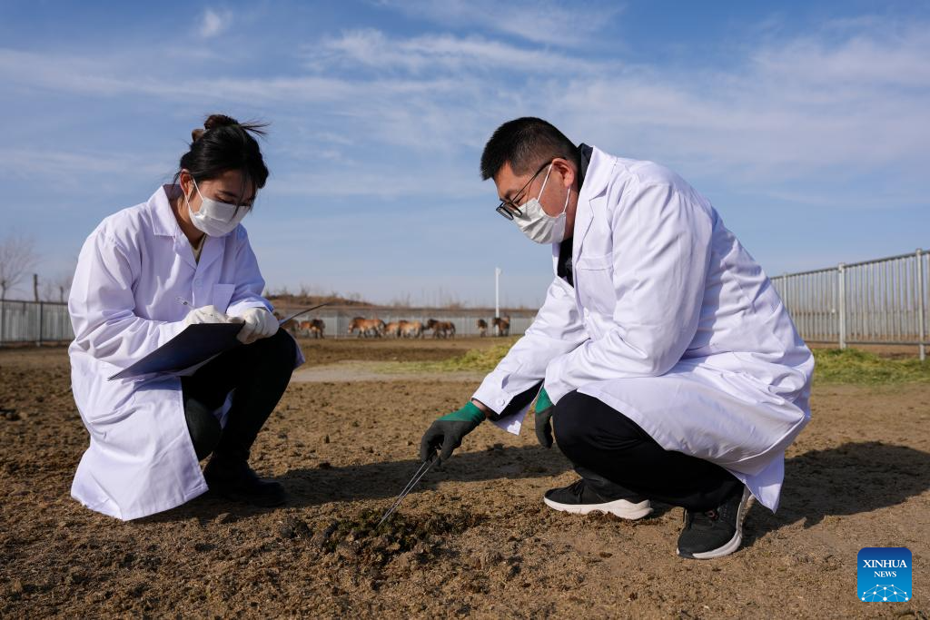 Staff members check the dung of Przewalski's horses at the Przewalski's horses breeding base of the Gansu Endangered Animal Protection Center in Wuwei City of northwest China's Gansu Province, Feb. 3, 2026. The Przewalski's horse is listed as a national first-class protected animal in China and remains endangered globally.