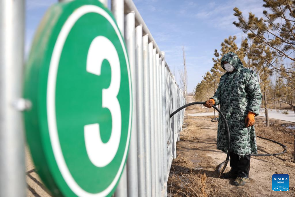 A staff offers water to Przewalski's horses at the Przewalski's horses breeding base of the Gansu Endangered Animal Protection Center in Wuwei City of northwest China's Gansu Province, Feb. 3, 2026. The Przewalski's horse is listed as a national first-class protected animal in China and remains endangered globally.