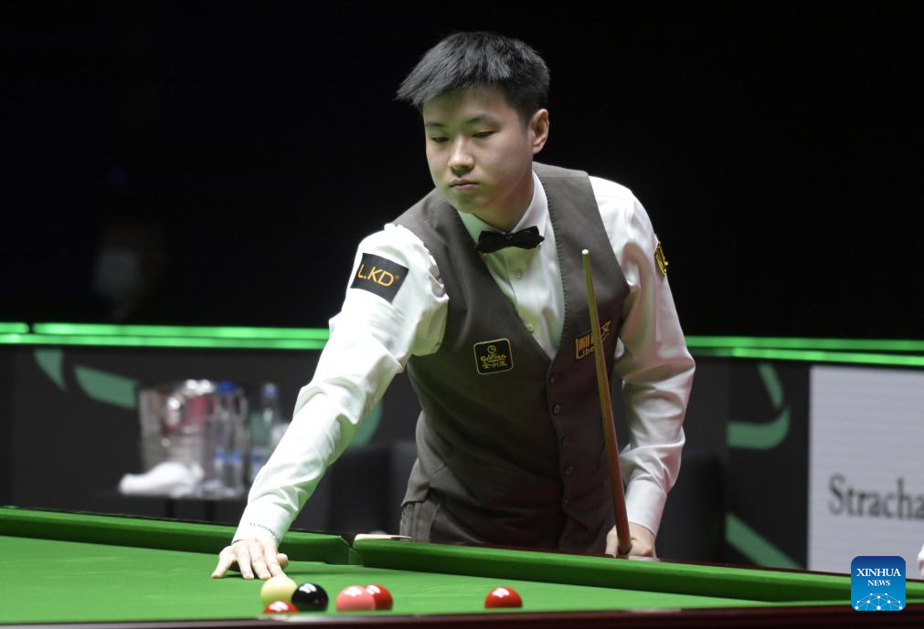 Zhao Xintong competes during the first round match between Zhao Xintong of China and John Higgins of Scotland at the Snooker World Grand Prix 2026 in Hong Kong, south China, Feb. 4, 2026. (Xinhua/Lo Ping Fai)