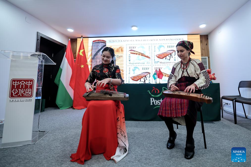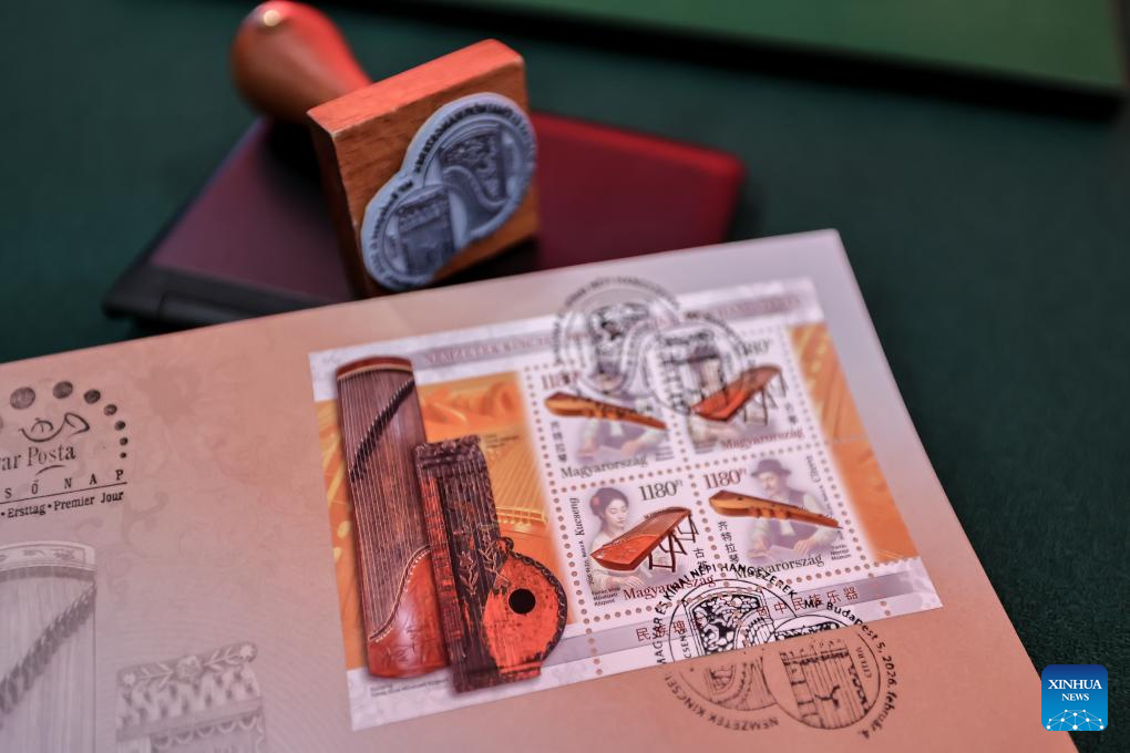An artist plays a guzheng solo at a launch ceremony of the "National Treasures: Traditional Hungarian and Chinese Instruments" stamps in Budapest, Hungary, on Feb. 4, 2026. Hungary and China on Wednesday jointly issued a commemorative stamp series titled "National Treasures: Traditional Hungarian and Chinese Instruments" for the upcoming Chinese New Year. (Photo by David Balogh/Xinhua)