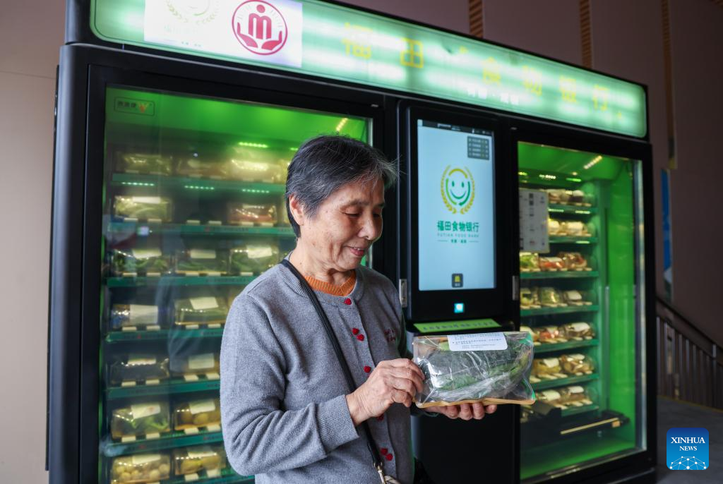 A resident collects food in front of a food bank terminal at Yitian Village of Futian District in Shenzhen, south China's Guangdong Province, Dec. 19, 2025. (Xinhua/Liang Xu)