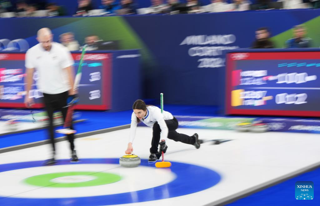 Italy's Stefania Constantini (R) and Amos Mosaner compete during the curling mixed doubles round robin session 2 between Italy and South Korea of the 2026 Milan-Cortina Winter Olympics in Cortina D'Ampezzo, Italy, Feb. 5, 2026. (Xinhua/Li Gang)