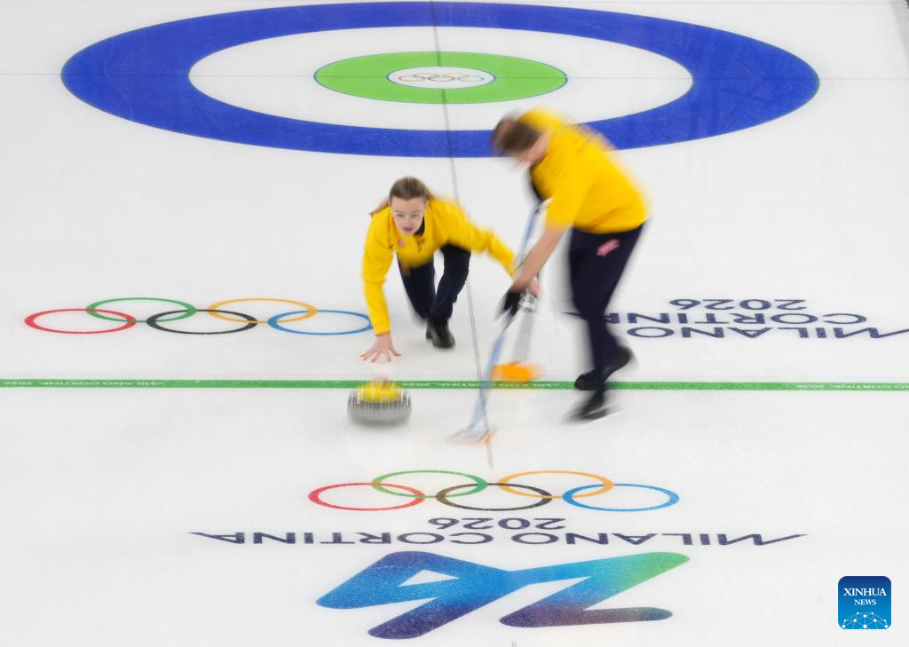 Isabella Wranaa (L) and Rasmus Wranaa of Sweden competes during the curling mixed doubles round robin session 2 match between the Czech Republic and Sweden of the 2026 Milan-Cortina Winter Olympics in Cortina D'Ampezzo, Italy, Feb. 5, 2026. (Xinhua/Li Gang)