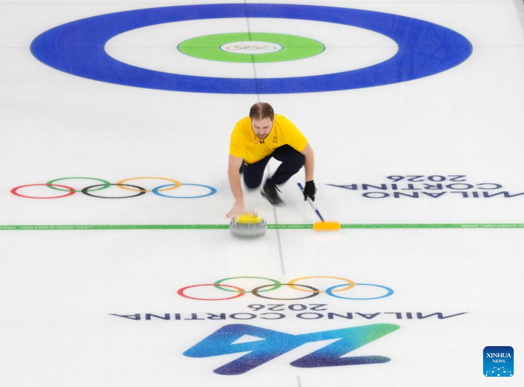 Rasmus Wranaa of Sweden competes during the curling mixed doubles round robin session 2 match between the Czech Republic and Sweden of the 2026 Milan-Cortina Winter Olympics in Cortina D'Ampezzo, Italy, Feb. 5, 2026. (Xinhua/Li Gang)