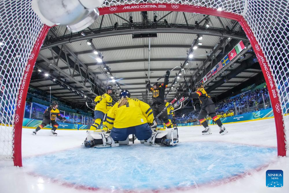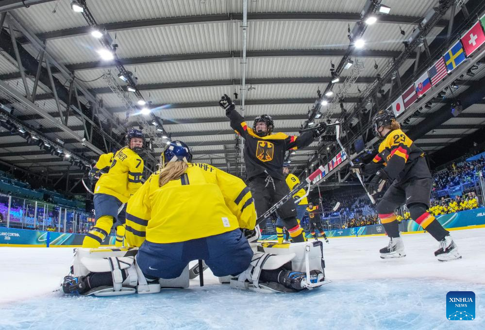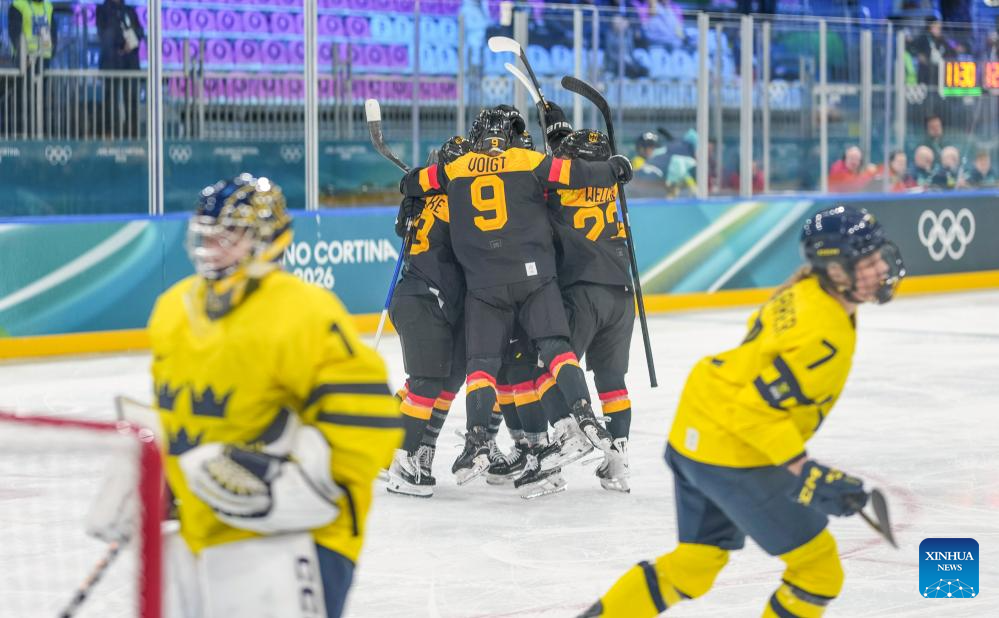 Players of Germany celebrate a goal during the ice hockey women's preliminary round group B match between Sweden and Germany of the 2026 Milan-Cortina Winter Olympics in Milan, Italy, Feb. 5, 2026. (Xinhua/Sun Fei)