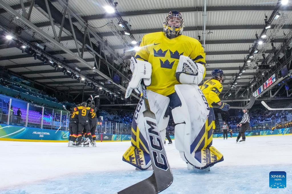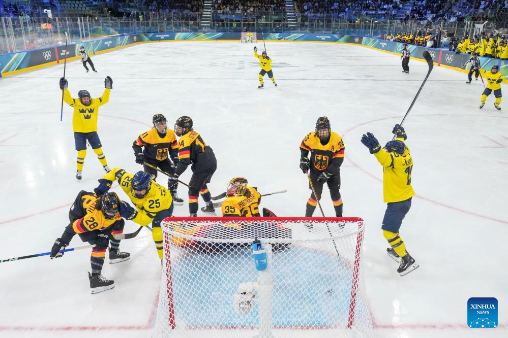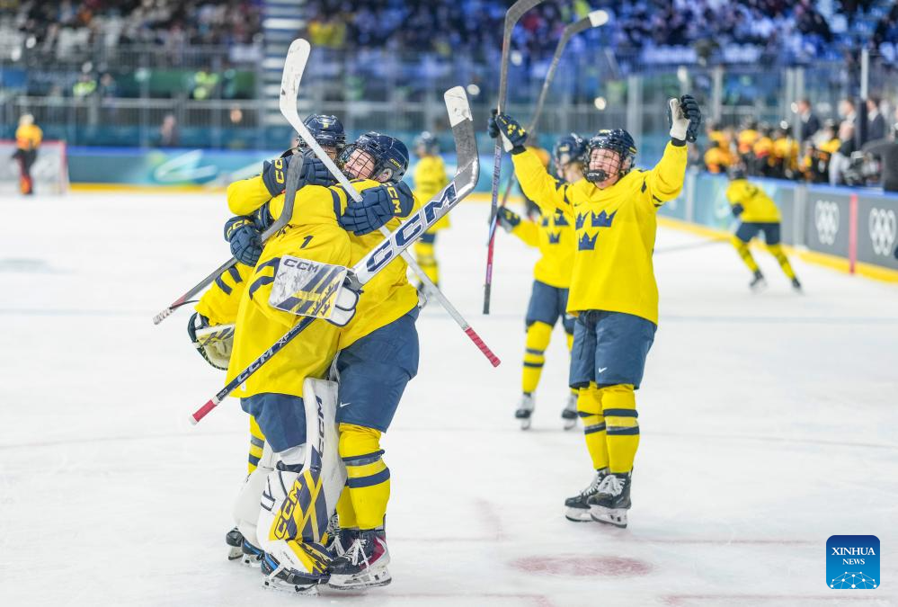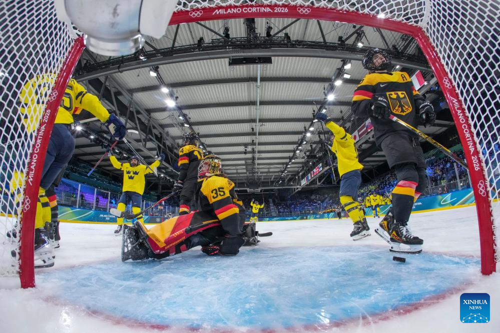 Players of Sweden celebrate after winning the ice hockey women's preliminary round group B match between Sweden and Germany of the 2026 Milan-Cortina Winter Olympics in Milan, Italy, Feb. 5, 2026. (Xinhua/Sun Fei)