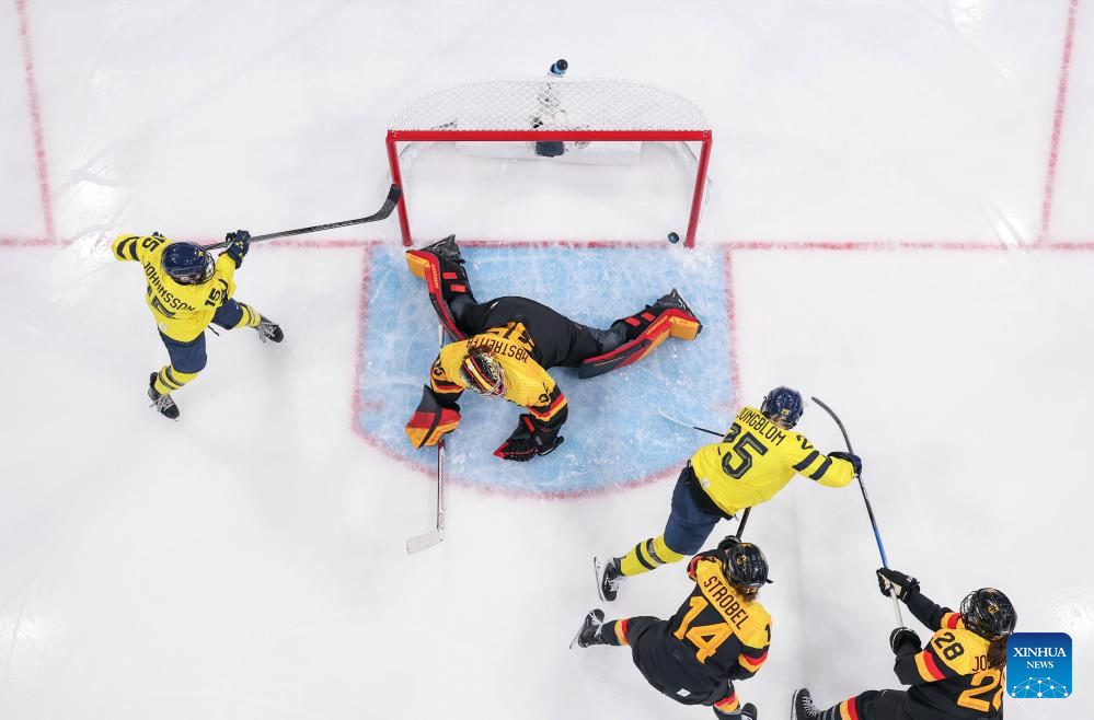 Svenja Voigt (2nd R) of Germany celebrates her goal during the ice hockey women's preliminary round group B match between Sweden and Germany of the 2026 Milan-Cortina Winter Olympics in Milan, Italy, Feb. 5, 2026. (Xinhua/Sun Fei)