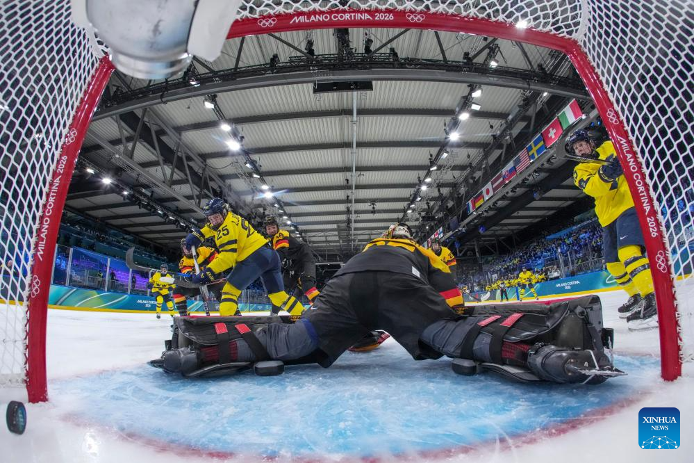 Lina Ljungblom (2nd R) of Sweden shoots to score during the ice hockey women's preliminary round group B match between Sweden and Germany of the 2026 Milan-Cortina Winter Olympics in Milan, Italy, Feb. 5, 2026. (Xinhua/Sun Fei)