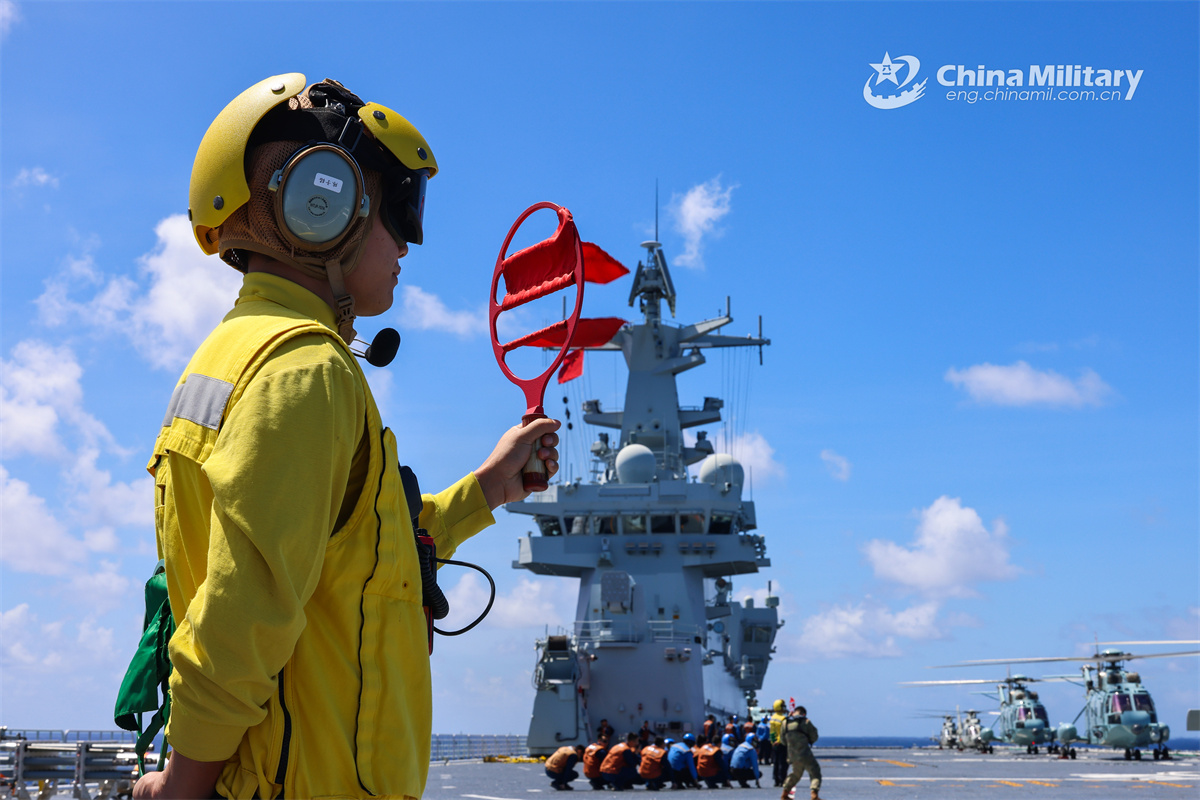 A sailor assigned to a flotilla of the Chinese PLA Navy guides the ship-borne helicopters to take off from the flight deck of amphibious assault ship Hainan (Hull 31) during a multi-subject maritime training in early January, 2026. (eng.chinamil.com.cn/Photo by Qiao Chenxi)