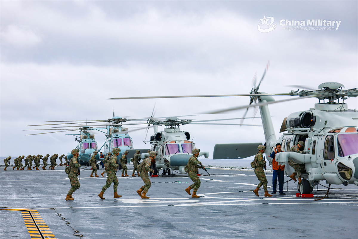 Soldiers assigned to a flotilla of the Chinese PLA Navy board Z-20J and Z-8C ship-borne helicopters on the flight deck of amphibious assault ship Hainan (Hull 31) during a multi-subject maritime training in early January, 2026. (eng.chinamil.com.cn/Photo by Qiao Chenxi)