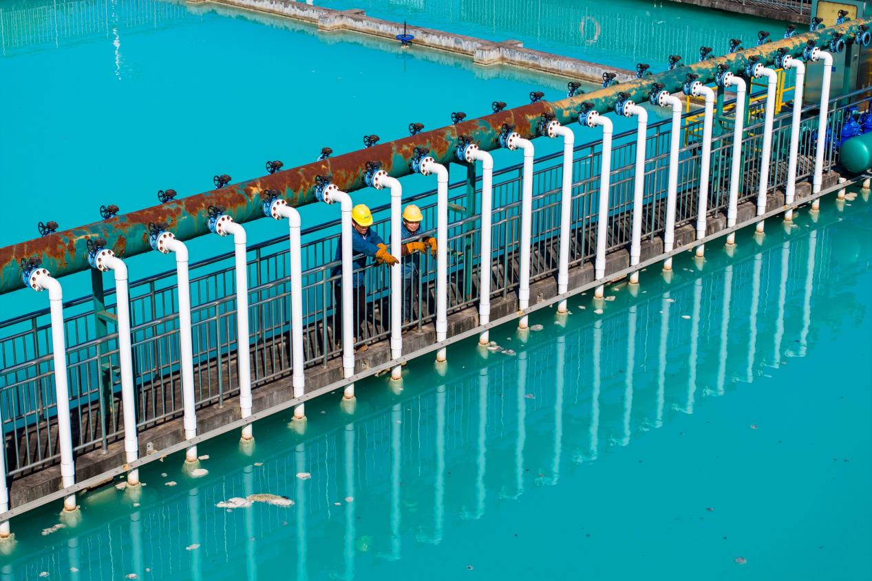 Workers of a company in east China's Anhui province inspect the operation of water treatment facilities. (Photo/Xiao Benxiang)