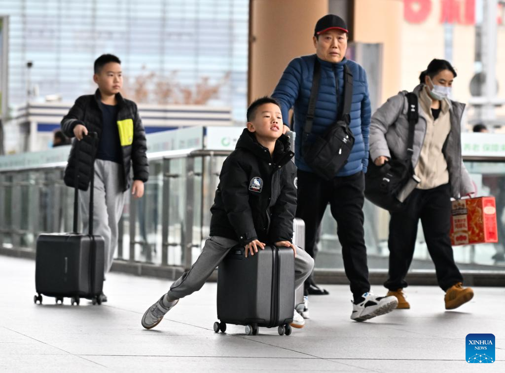 Children travelling with their families are about to take a train at the Nanjing South Railway Station in Nanjing, east China's Jiangsu Province, Feb. 6, 2026. (Xinhua/Ji Chunpeng)