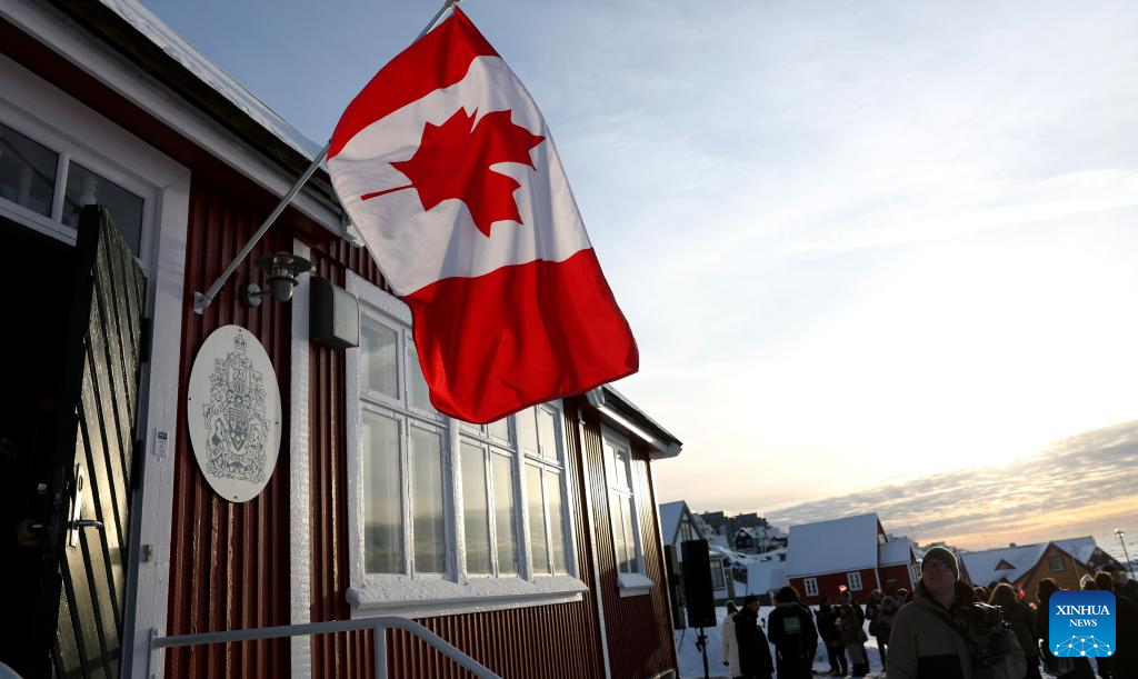 Photo taken on Feb. 6, 2026 shows a Canadian flag outside Canada's new consulate in Nuuk, the capital of Greenland, Denmark. On Friday, France and Canada each opened a consulate in Nuuk. (Xinhua/Li Ying)