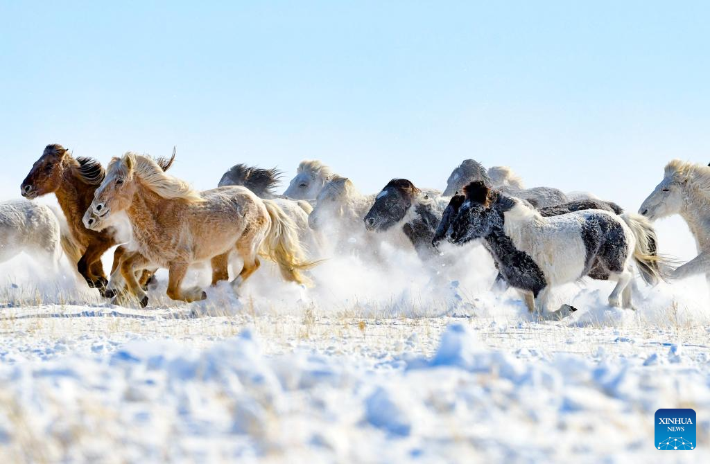 Horses run on a snowfield during a new year event in Xilinhot City, Xilingol League, north China's Inner Mongolia Autonomous Region, Feb. 5, 2026. (Photo by Wang Zheng/Xinhua)