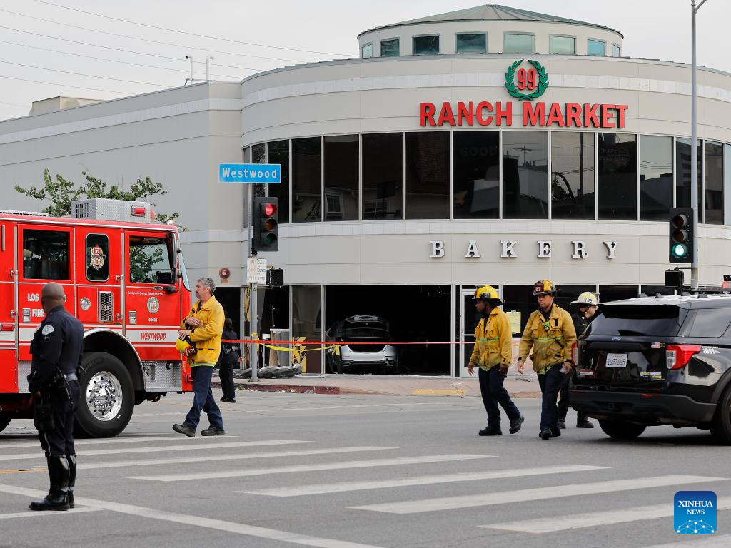 Police officers and firefighters are seen at the accident site after a vehicle crashed into the 99 Ranch Market in the Westwood neighborhood in Los Angeles, California, the United States, on Feb. 5, 2026. At least three people were killed and multiple others injured after a vehicle crashed into a grocery store in the Westwood neighborhood in the U.S. city of Los Angeles on Thursday, according to local authorities. (Photo by Qiu Chen/Xinhua)