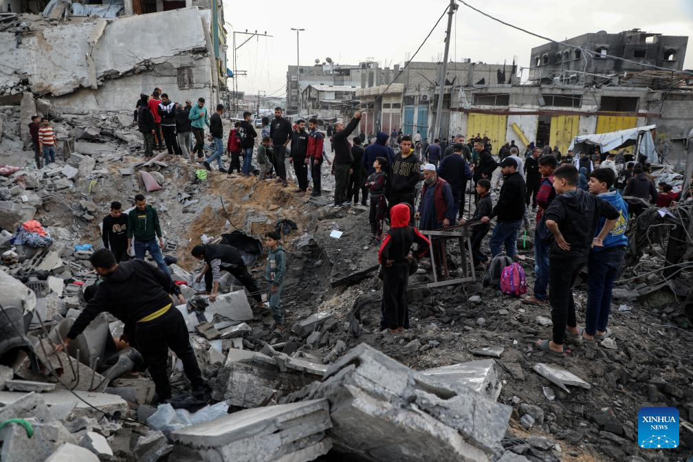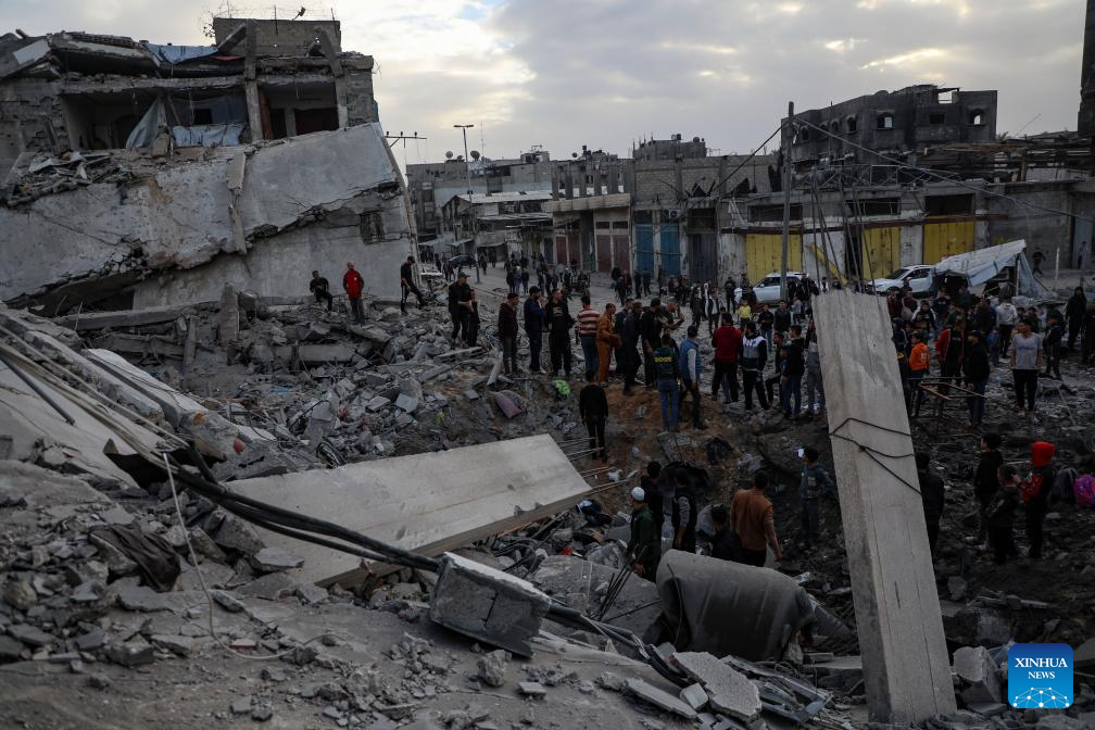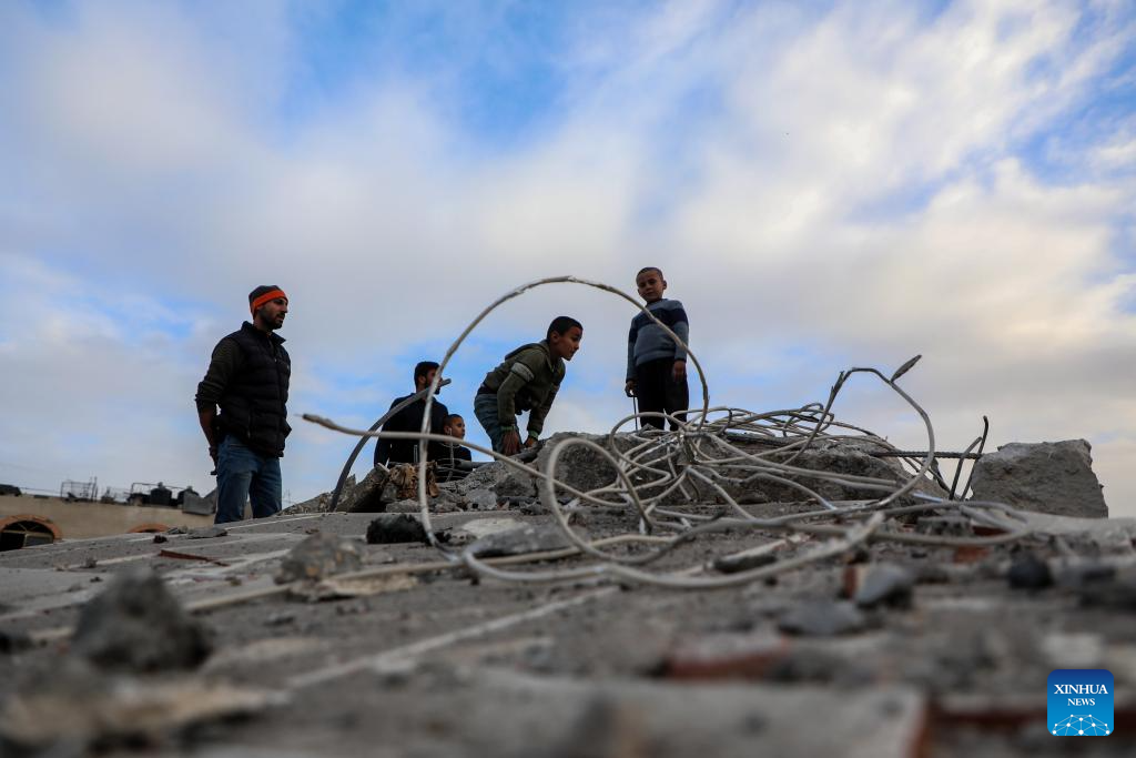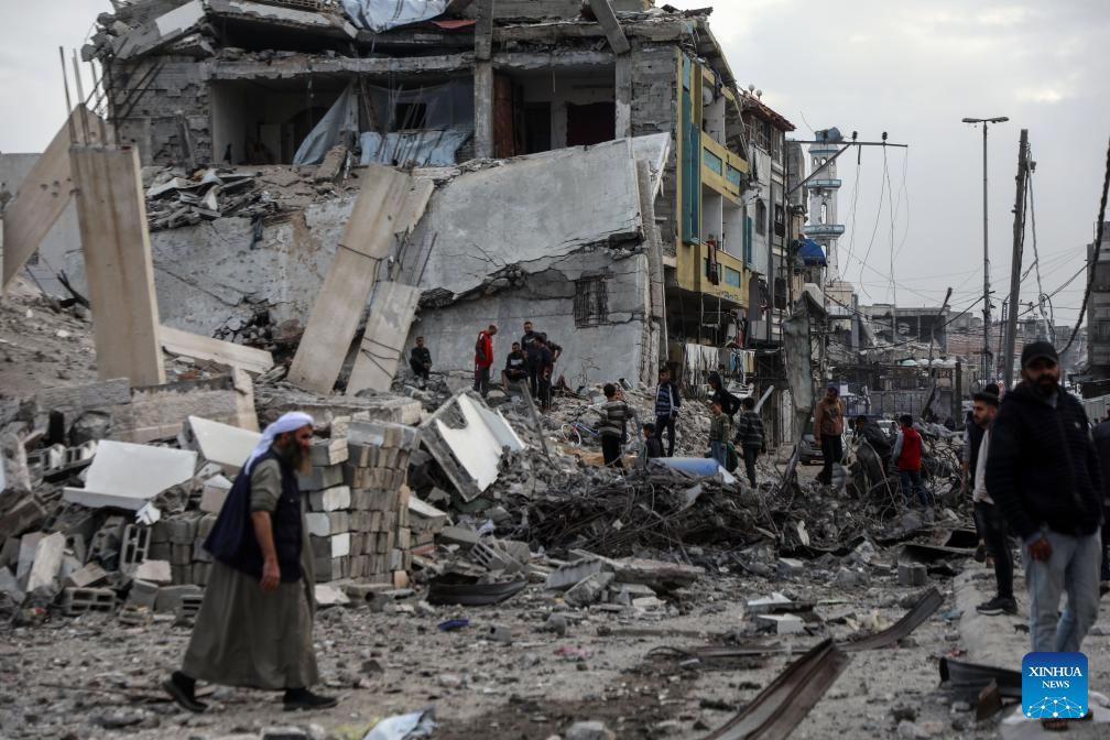 Palestinians inspect the damage after an Israeli airstrike that destroyed a three-story building in the Zeitoun neighborhood, southeast of Gaza City, on Feb. 6, 2026. (Photo by Rizek Abdeljawad/Xinhua)