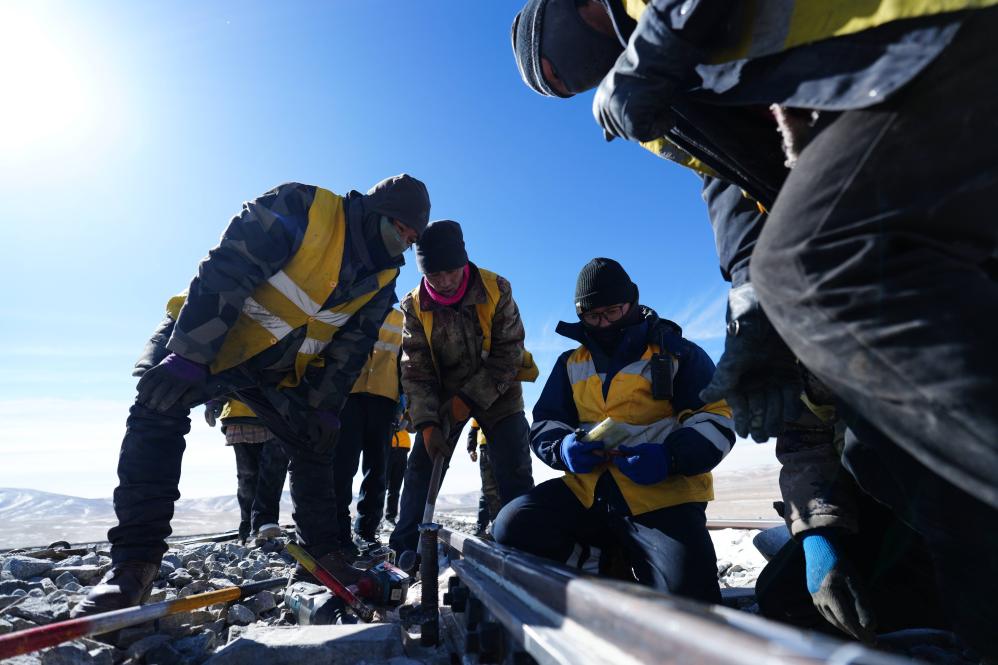 Staff members of the Wangkun Line maintenance workshop in Golmud section under China Railway Qinghai-Xizang Group Co., Ltd. maintain the rail along the Qinghai-Xizang Railway in northwest China's Qinghai Province, Feb. 6, 2026. (Xinhua/Zhang Long)