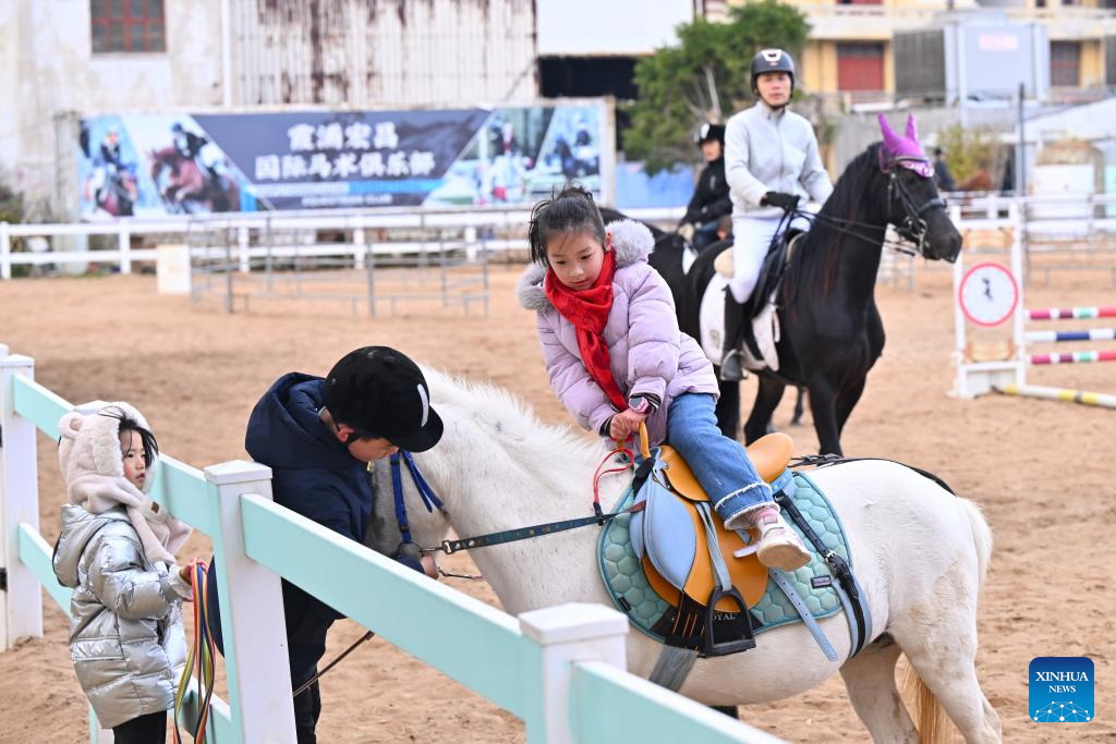 A girl learns horse riding at a racecourse of a cultural and creative base in Xiapu County, southeast China's Fujian Province, Feb. 7, 2026. Horse-themed tourism has surged recently in Xiapu County as the lunar Year of the Horse approaches. (Xinhua/Jiang Kehong)
