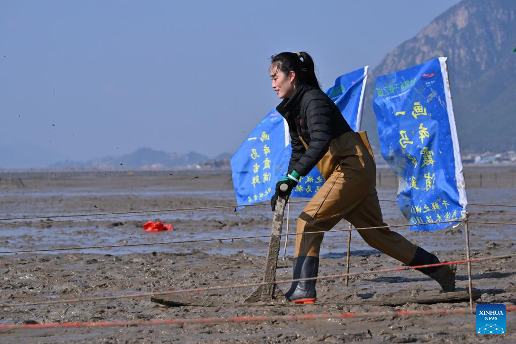 A woman attends a "munima" racing competition in Xiapu County, southeast China's Fujian Province, Feb. 8, 2026. "Munima," meaning "wooden mud horse" in Chinese, is a traditional sled-like tool for gliding over tidal flats to pick up seafood. Horse-themed tourism has surged recently in Xiapu County as the lunar Year of the Horse approaches. (Xinhua/Jiang Kehong)