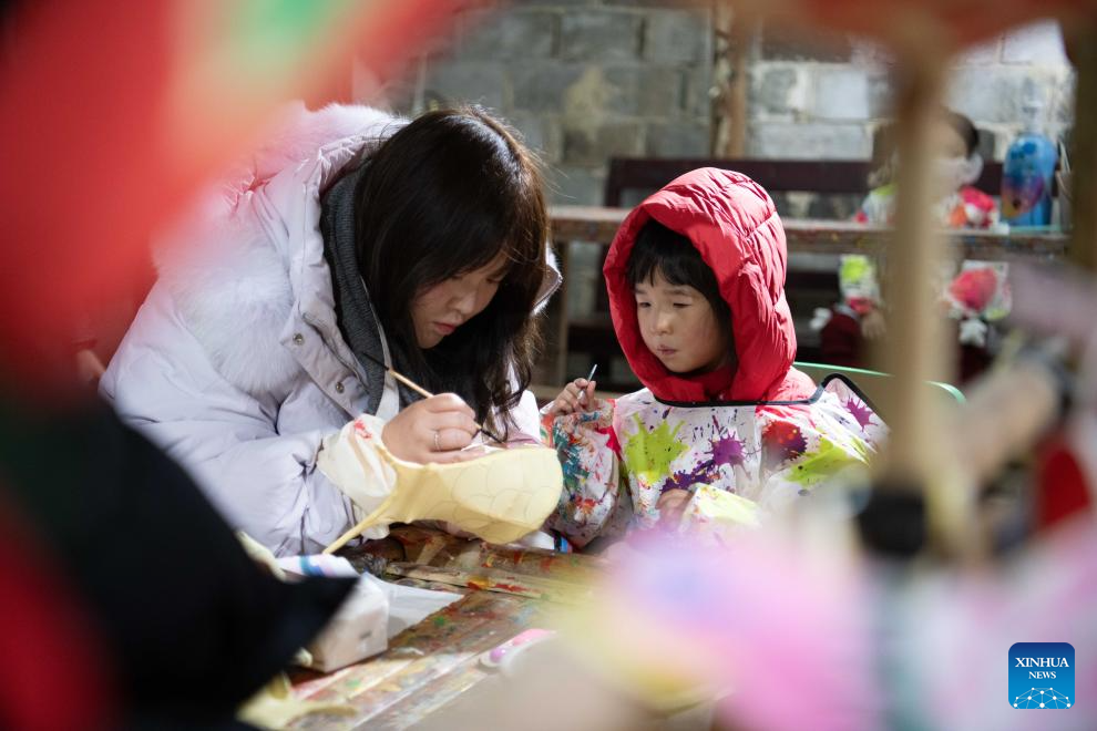 A woman and her child make a fish lantern in Bishan Village of Yixian County, east China's Anhui Province, Feb. 7, 2026.