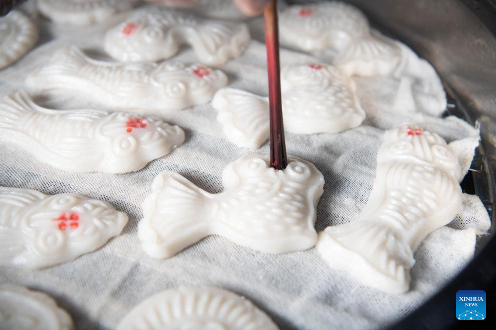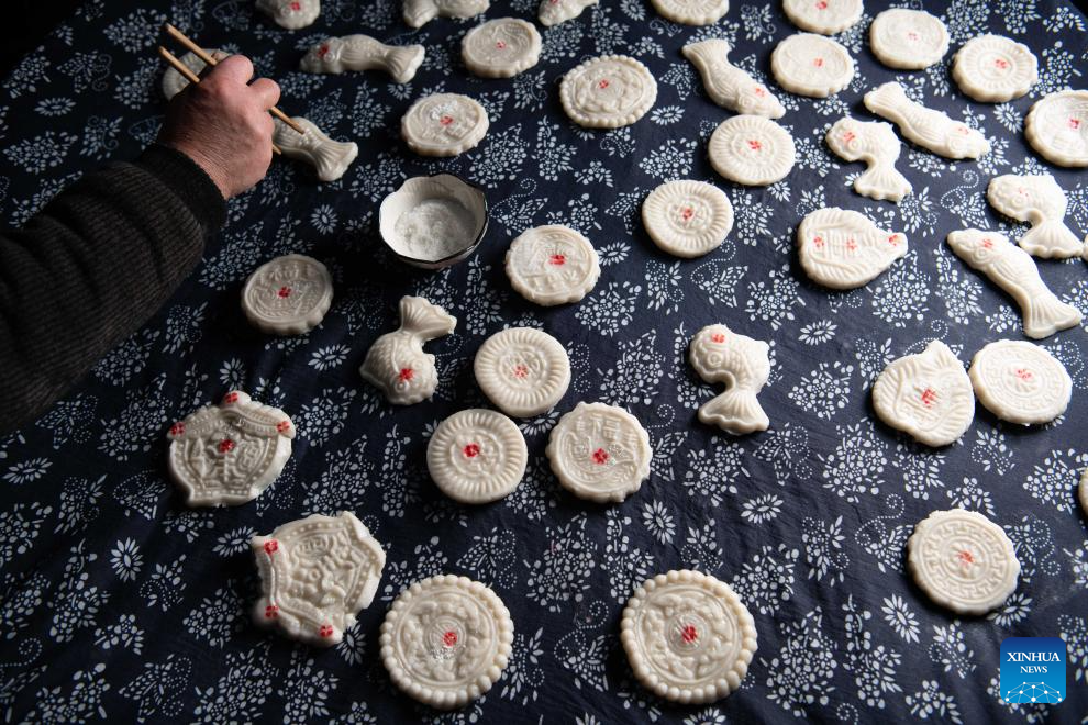 A villager makes steamed rice cakes with different patterns in Nanping Village of Yixian County, east China's Anhui Province, Feb. 6, 2026.