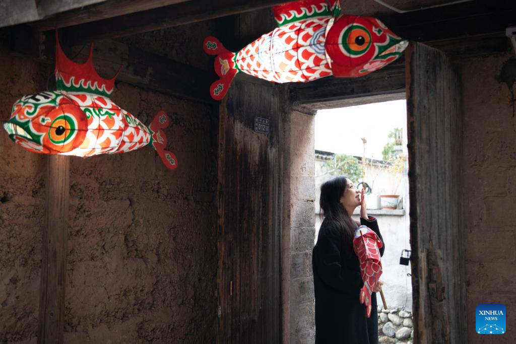 A tourist poses for photos with a fish lantern in Bishan Village of Yixian County, east China's Anhui Province, Feb. 7, 2026.