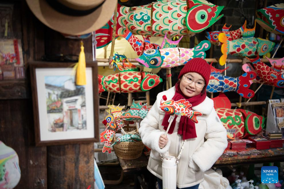 A girl poses for photos at a fish lantern workshop in Bishan Village of Yixian County, east China's Anhui Province, Feb. 7, 2026.