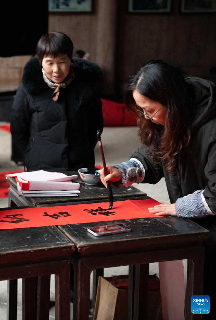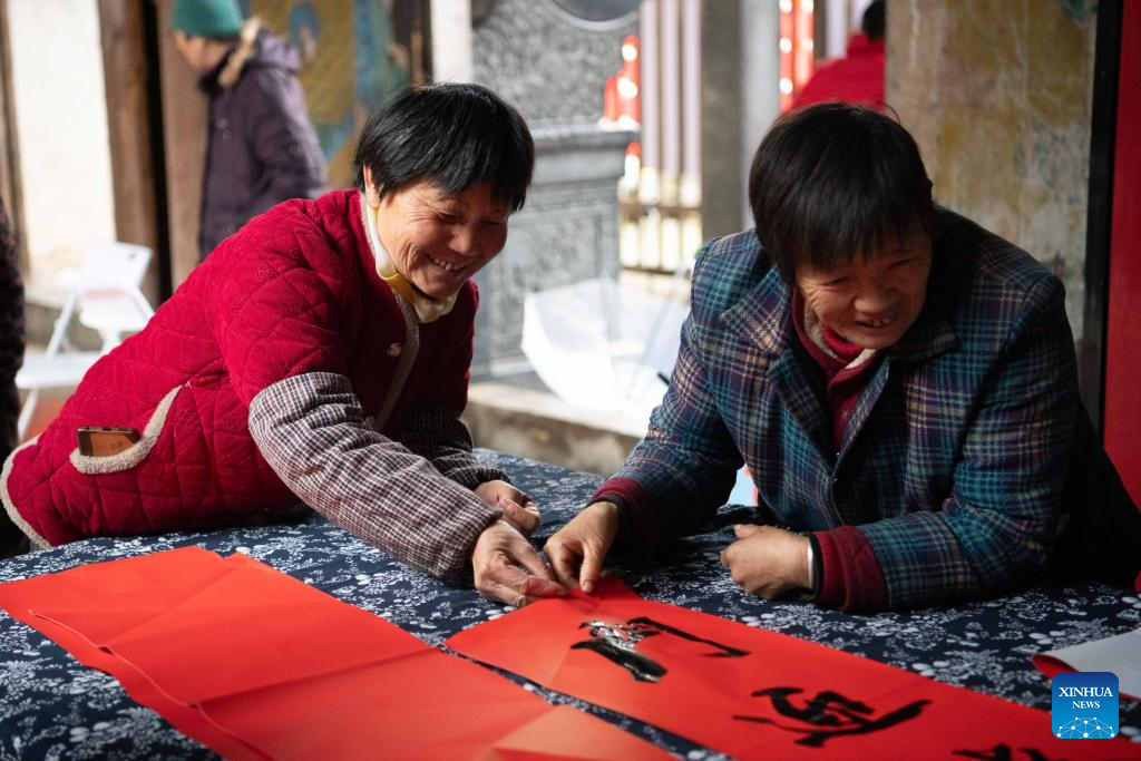 Villagers write spring couplets in Nanping Village of Yixian County, east China's Anhui Province, Feb. 6, 2026.