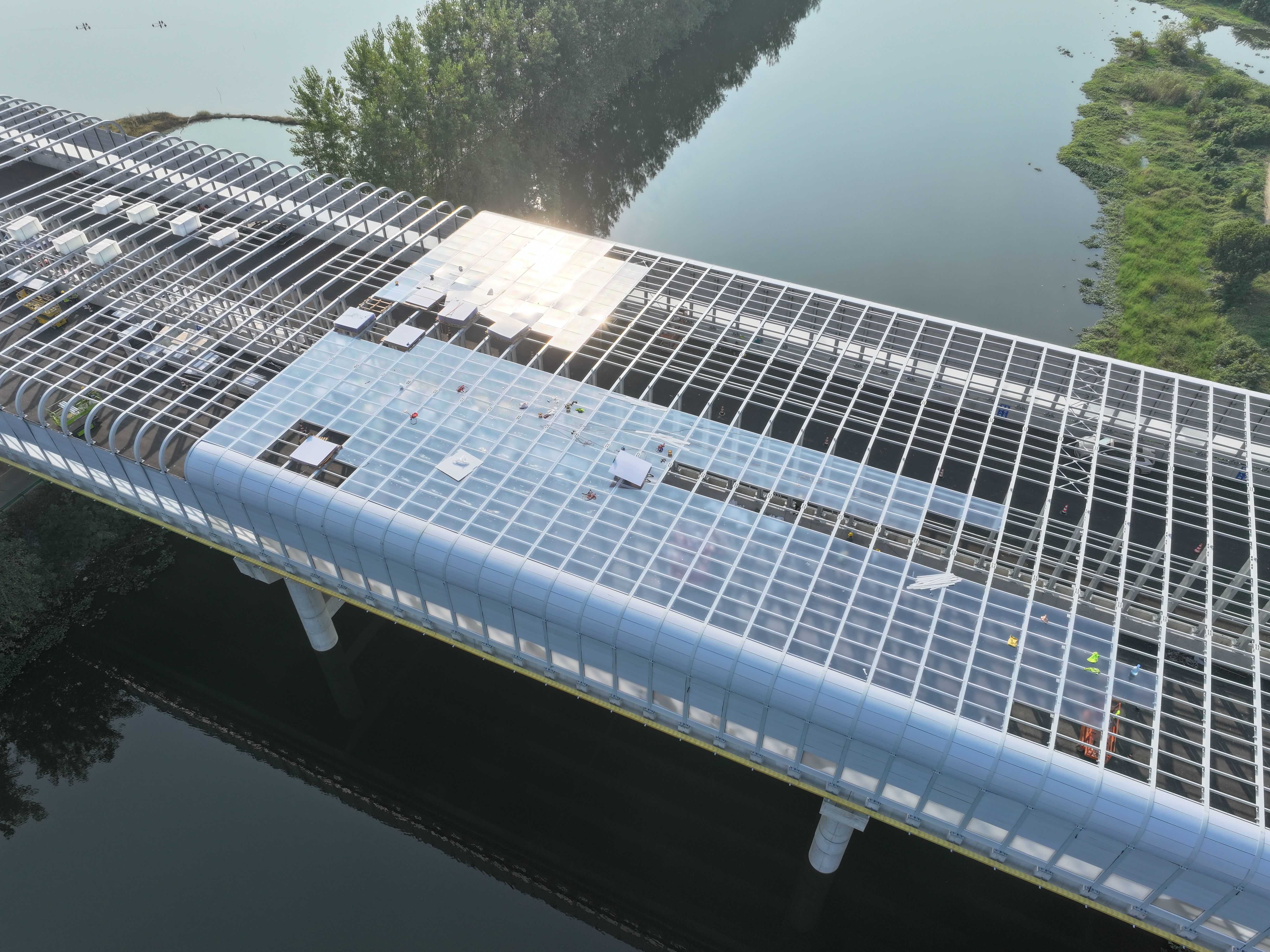 Photo shows an enclosed noise barrier under construction on the Shuangliu Yangtze River Bridge in central China's Hubei Province. (Photo/Changjiang Daily)