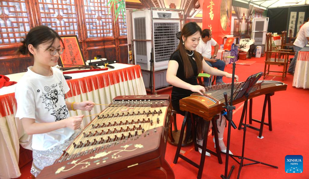 Artists play traditional Chinese instrument at a Chinese-Cambodian cultural exhibition in Phnom Penh, Cambodia, on Feb. 7, 2026. A Chinese-Cambodian cultural exhibition is being held in Phnom Penh, capital of Cambodia, to celebrate the upcoming Chinese New Year, or the Spring Festival. Lasting from Friday to Sunday, the three-day cultural event was designed to provide revelers with an opportunity to experience the rich tapestry of the Chinese New Year. (Photo by Phearum/Xinhua)