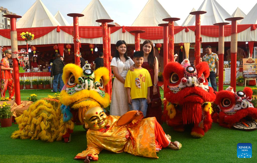 Visitors pose for a photo with a lion dance troupe at a Chinese-Cambodian cultural exhibition in Phnom Penh, Cambodia, on Feb. 7, 2026. A Chinese-Cambodian cultural exhibition is being held in Phnom Penh, capital of Cambodia, to celebrate the upcoming Chinese New Year, or the Spring Festival. Lasting from Friday to Sunday, the three-day cultural event was designed to provide revelers with an opportunity to experience the rich tapestry of the Chinese New Year. (Photo by Phearum/Xinhua)